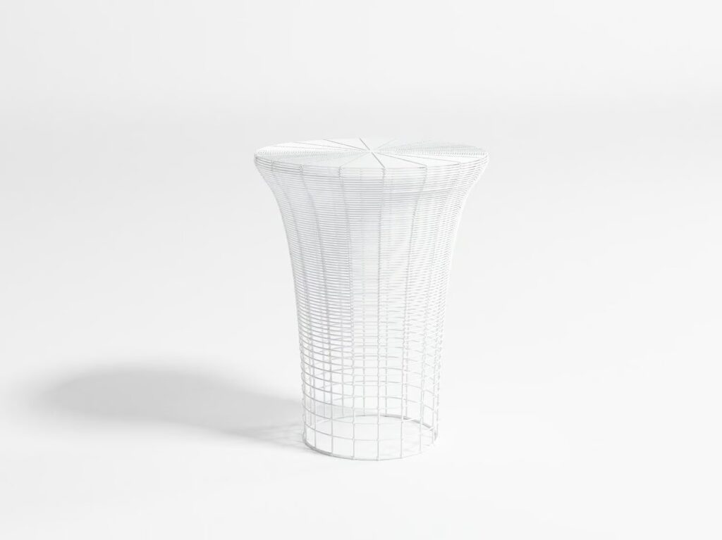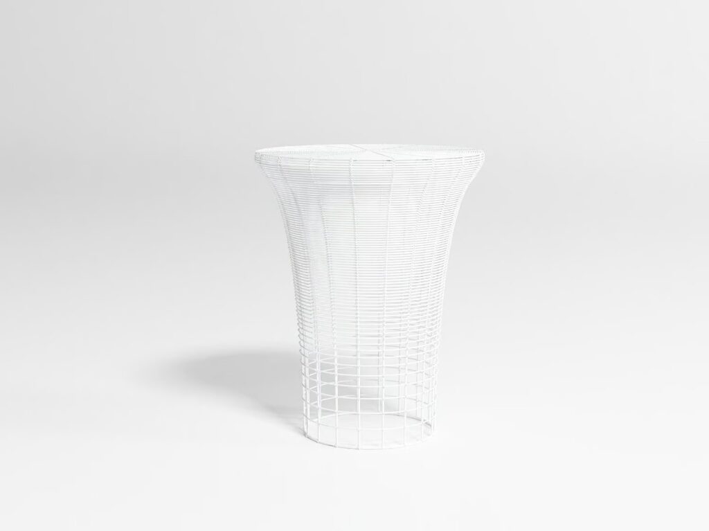 “Diese Kollektion von Hockern und Beistelltischen wird mittels der in Indien traditionellen Technik des Verflechten von Drähten rund um eine Struktur aus Metall hergestellt. Die zwischen den Drähten verbleibenden Zwischenräume werden schrittweise ausgedehnt, sodass ein Abstufungseffekt entsteht. Es handelt sich folglich um ein Design, das durch eine Änderung an einer schon vorhandenen Technik geschaffen wird.”