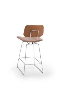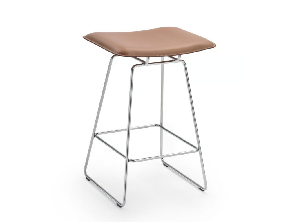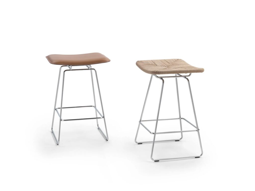 Eine andere stilistische Interpretation zeigt der Stühle und Sesselstühle für das Esszimmer und Hockerist Echoes S.H., bei dem das Metallgestell mit Leder kombiniert wird: Eine einfache, aber effektvolle Kombination, die dank der ergonomischen Form von Sitz und Rückenlehne hohen Komfort garantiert.