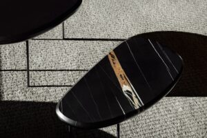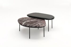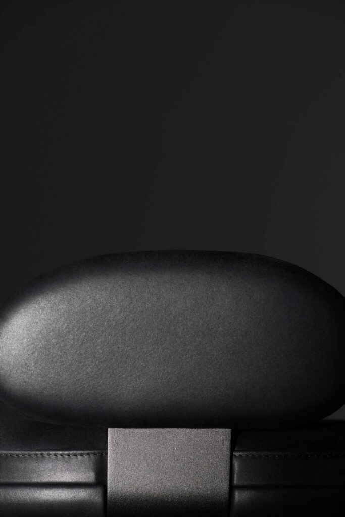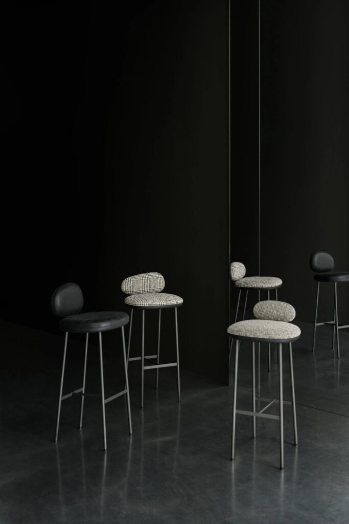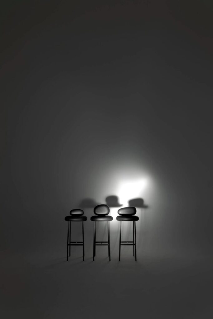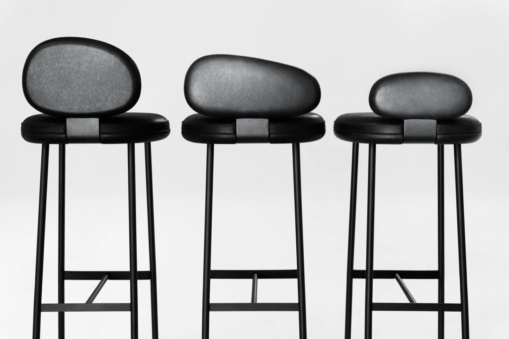 Pebble ist ein Hocker, der in zwei Höhen und drei verschiedenen Rückenlehnenvarianten erhältlich ist. Das Gestell besteht aus einer Sitzplatte aus 5 mm dickem Stahlblech und Beinen aus Ø18-mm-Stahl mit Querstreben von 20x5 mm und Ø14-mm-Stäben, die als Fussstützen dienen; die vordere Querstrebe der Fussstütze ist mit einer Schutzdichtung aus Hartgummi versehen. Sitz und Rückenlehne mit einer Struktur aus zwei Schalen, deren Aussenteile aus beschichtetem Pappelsperrholz und deren Innenteile aus einer Pappelsperrholzplatte mit geformter Polyurethanschaumpolsterung bestehen, beide mit einem Bezug versehen. Die beiden Teile der Rückenschalen werden durch ein Presssystem miteinander verbunden, die beiden Teile der Sitzschalen durch Schrauben. Nicht abnehmbare Polsterung, standardmässig in schwarzem Caresse 807-Leder für Aussenteile, unter dem Sitz und der Rückenlehne; für die gepolsterten Teile ebenfalls feste Polsterung, erhältlich in Leder oder Stoff. Die Rückenlehnenschale ist durch eine gebogene 5 mm starke Stahlplatte mit dem Untergestell verschraubt, die Sitzschale ist mit der Sitzträgerplatte verschraubt. Alle Metallteile sind mit einer grauen Epoxid-Pulverbeschichtung versehen. Der Halt auf dem Boden wird durch selbstnivellierende Kunststofffüsse mit austauschbaren Spitzen je nach Auflagefläche gewährleistet.