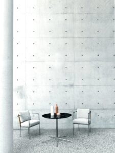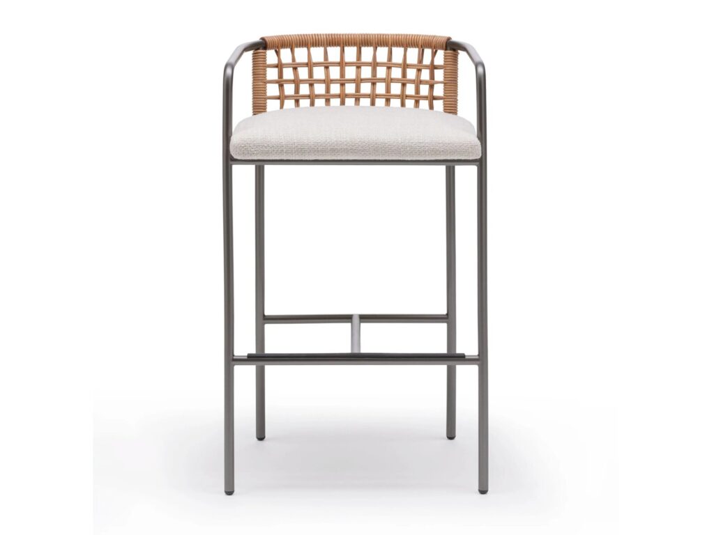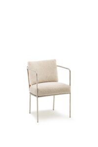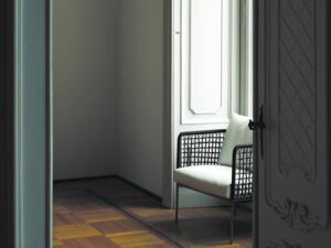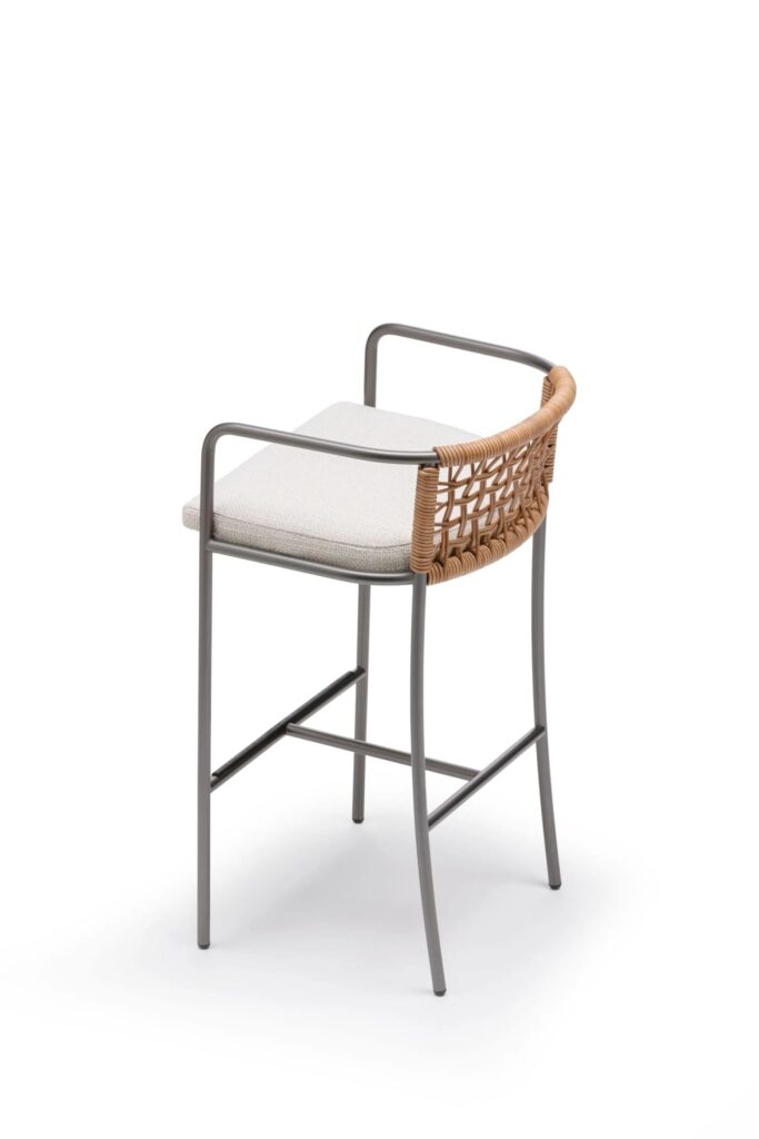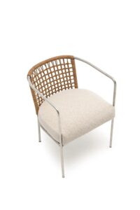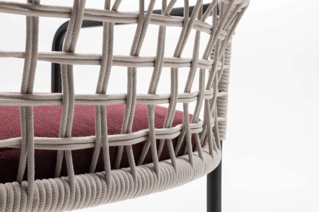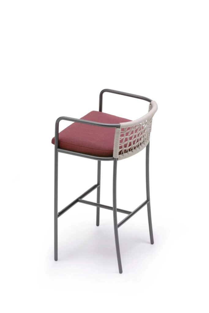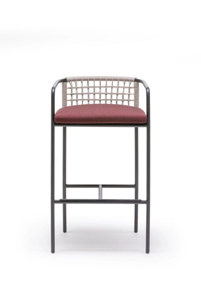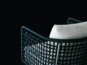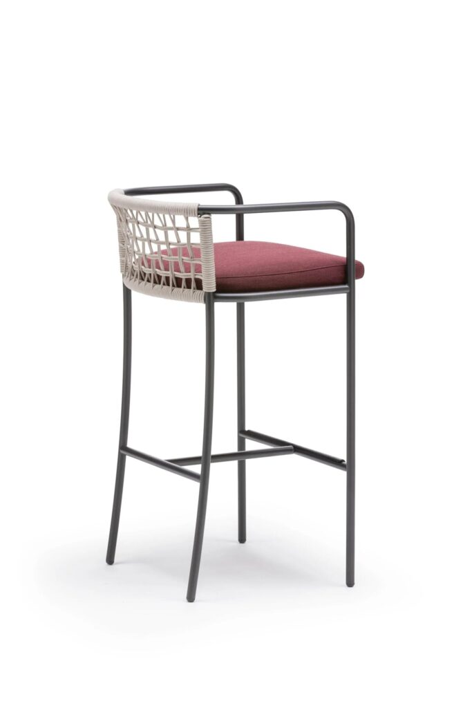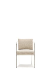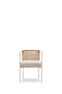 Outdoor version: frame in AISI 316 stainless steel tube with matte satin finish, or with epoxy polyester powder coating in Gunmetal grey and burnished color. Seat frame in outdoor plywood and open cell polyurethane foam padding, with a draining fabric cover. Woven with PVC profile or synthetic cord, in the colors in collection. Upholstery with outdoor fabrics, fully removable with zippers, upon unscrewing the seat from the frame. Seat depth 45cm.