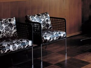 Indoor version: frame in steel tube with epoxy polyester powder coating in Gunmetal grey or burnished color. Seat panel in poplar plywood and polyurethane foam padding covered with 100% polyether coupled with a thermo-fixed polyamide velveteen backing. Weaving with hide profile or synthetic rope in the collection finishes. Fabric or leather upholstery, fully removable with zippers and Velcro fastenings, by unscrewing the seat from the frame.