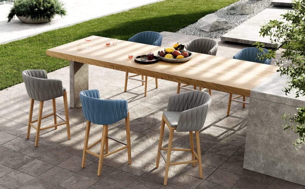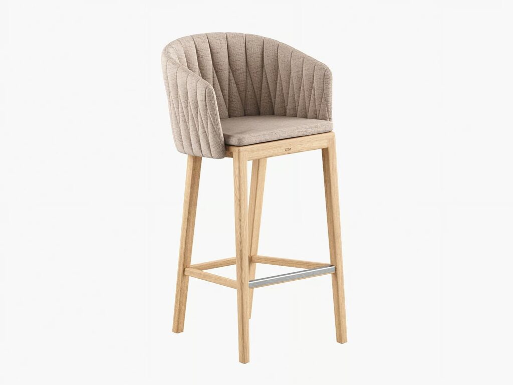 Calypso ist ein hoher Hocker aus Stoff und Teakholz.