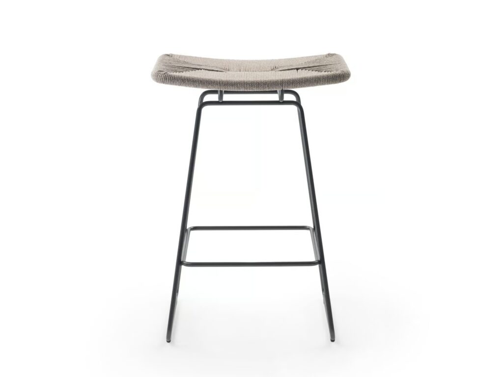 Die Konstruktion des Stuhls und des Sessels Echoes Outdoor ist durch einen markanten materischen Kontrast geprägt: Das Gestell besteht aus nüchternem Edelstahl, die Sitzfläche und Rückenlehne haben eine Bespannung aus Polypropylenschnur matt in den Farben Natur, Eisblau, Strohgelb und Anthrazit.