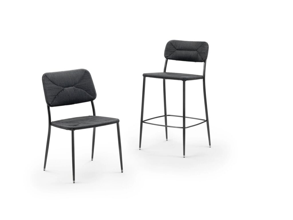 Das geschwungene Metallgestell geht in die Rückenlehne über und wird mit Pulverbeschichtung behandelt. Das dichte Geflecht der Sitzfläche und der Rückenlehne ist in der Ausführung aus Papierkordel oder Flechtschnur aus Seegras erhältlich und wird in reiner Handarbeit gefertigt. Das gleiche Design und die gleichen Materialien prägen auch den Hocker, der mit seinem diskreten Erscheinungsbild ausgesprochen vielseitig ist und sich mit Charme und Diskretion in jedes Ambiente einfügt.