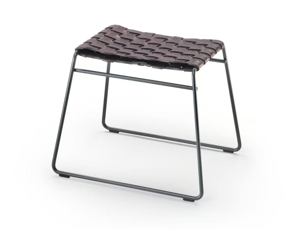 Gestell: aus Metall satiniert, verchromt, brüniert, Chrom Schwarz, Gunmetal Grau oder in der Farbe Weiß 100. Bespannung aus geflochtenem Kernleder in den Farben: Schwarz (5005), Tabak (5015), Schokoladenbraun (5004) und Schokoladenbraun dunkel (5013).
