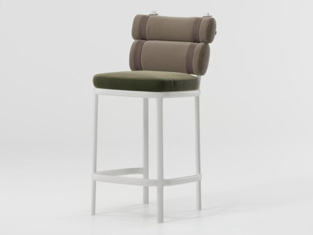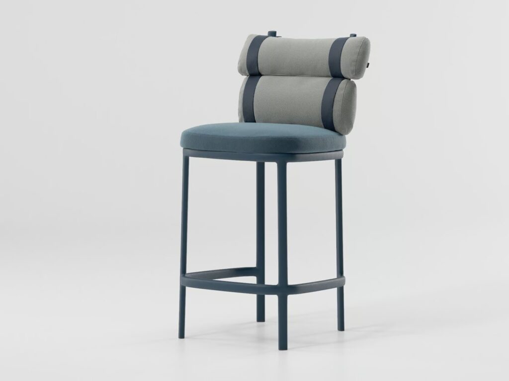 Dieser ironische Eingriff in die herkömmliche Polsterung verwandelt eine reguläre Rückenlehne in zwei unabhängige "Hüllen", die durch bunte Bänder verbunden sind. Eine grafische Aluminiumstruktur umrahmt den Protagonisten dieses Stuhls, die Kissen.