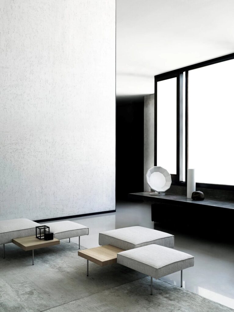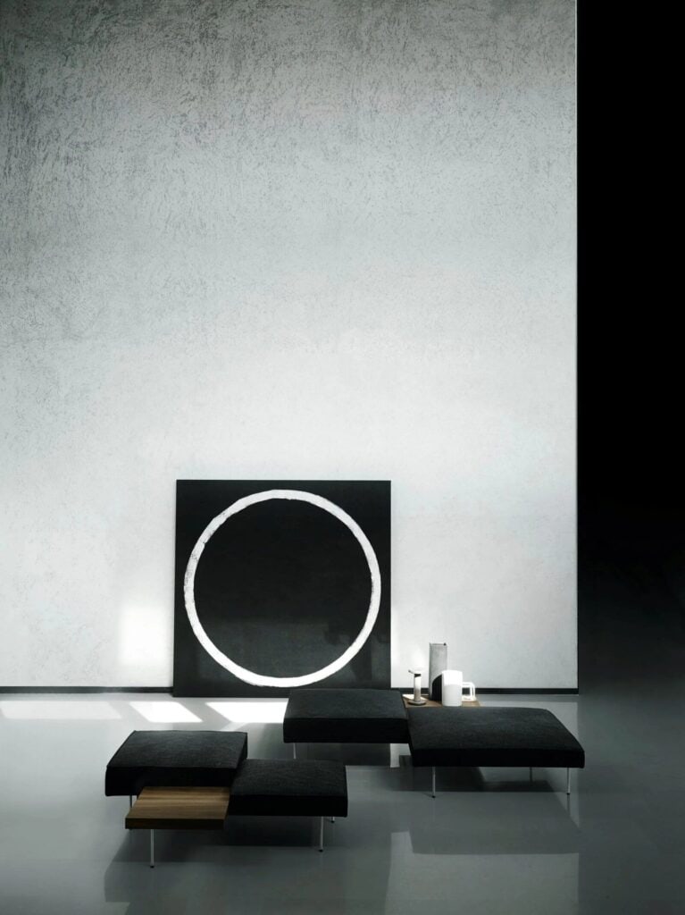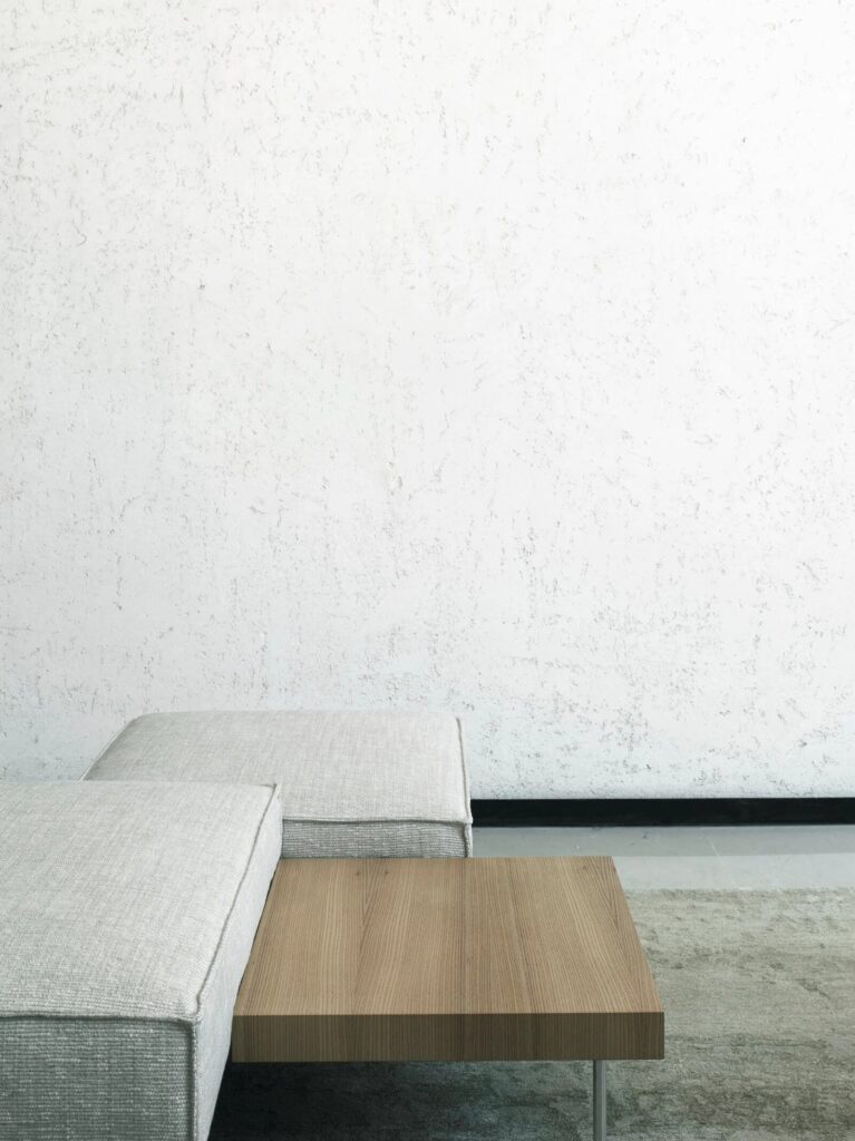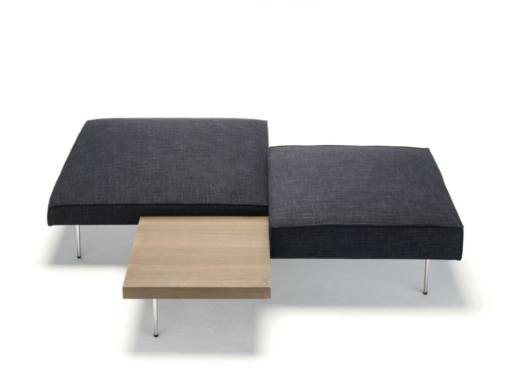 UPLAND ist ein Element, das aus einem Couchtisch und zwei Sitzelementen besteht, mit einem Gestell aus pulverbeschichtetem Stahl. Die Tischplatte besteht aus 20 mm dickem MDF, furniert mit Ulme oder Thermo-Eiche und ist mit Acrylfarbe auf Wasserbasis lackiert. Sitzelemente aus mehrschichtigem, gepolstertem Polyurethanschaum, bezogen mit vernadeltem, geharztem Polyestervlies, das auf eine Polyamidsamtunterlage geklebt ist. Füsse aus Edelstahl AISI 304, ø15 mm, matt satiniert, mit verstellbaren Spitzen aus schwarzem PVC, mit einer Buchse am Sockel verschraubt.