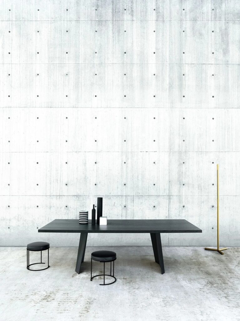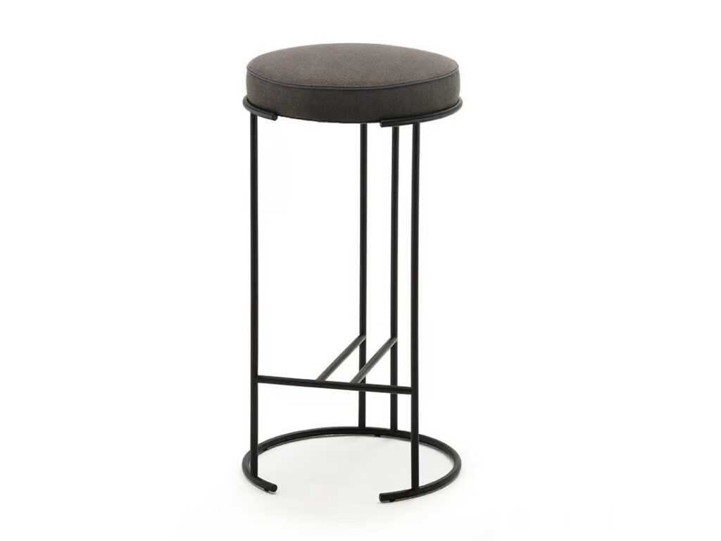 Indoor-Version: Gestell aus Rundstahl Ø 12 mm Epoxid-Pulverbeschichtung in RAL K-7 9017 matt schwarz. Sitz aus Pappel Sperrholz und Polsterung aus Polyurethanschaum, mit Acrylfasergewebe bezogen. Bezug in Leder und einem Keder in derselbe Ausführung, oder mit Stoff und Grosgrainkeder.