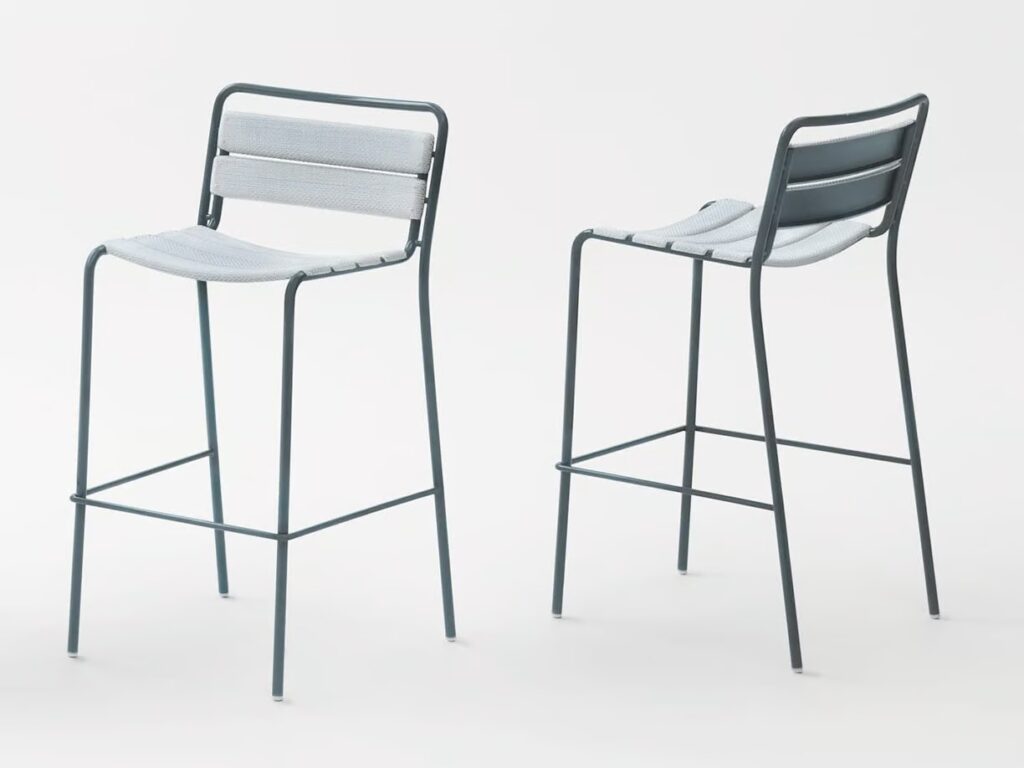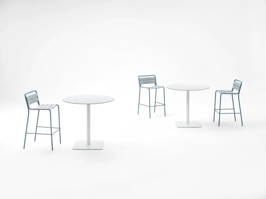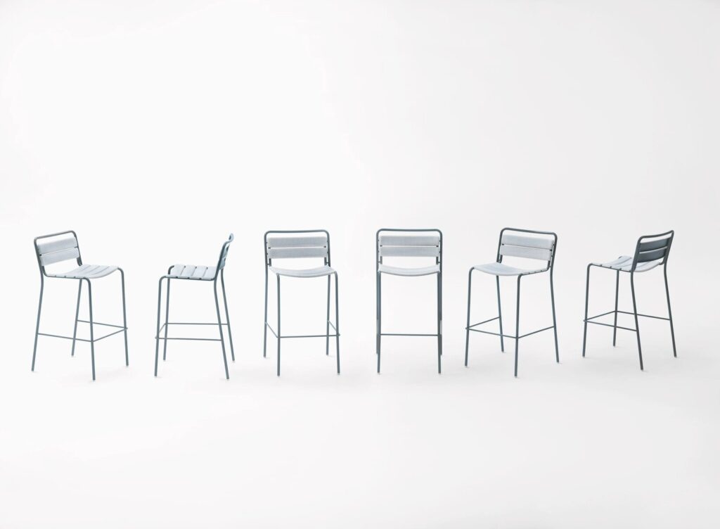 Der Stuhl Elba ohne Armlehnen, der Stuhl mit Armlehnen und der Barhocker können bis zu vier Stück gestapelt werden.