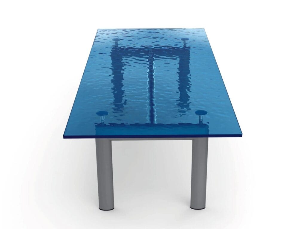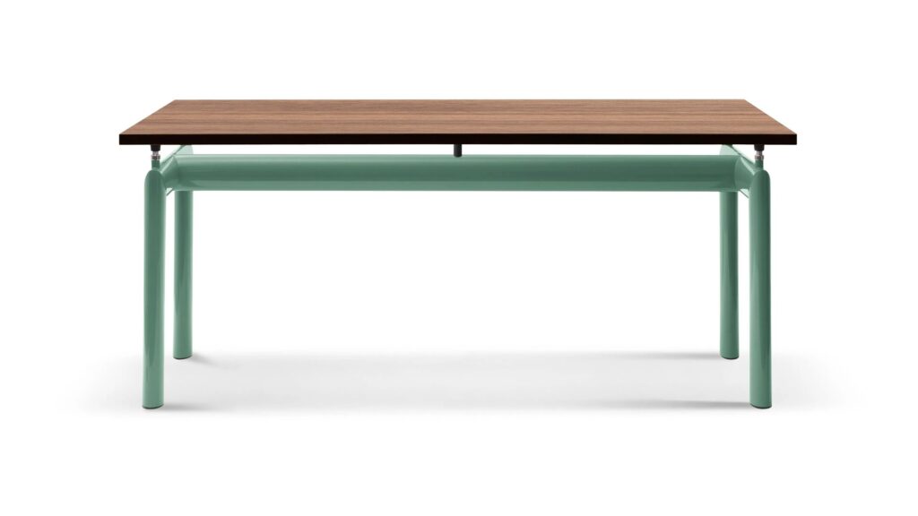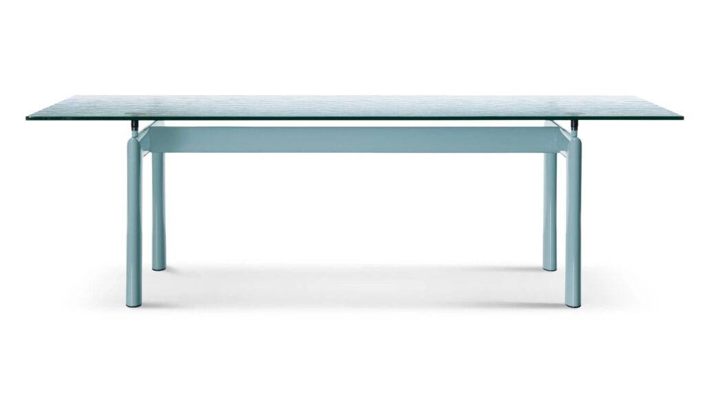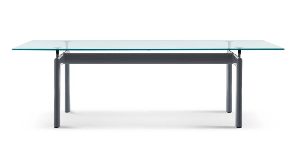 Die Idee, die dem Tisch Table tube d'avion zugrunde liegt, der 1929 im Salon d'Automne präsentiert wurde, ist die Trennung zwischen dem tragenden Element und dem getragenem Element, also zwischen dem Gestell und der Tischplatte. Die Eigenständigkeit der beiden Elemente wird durch vier Stützen zwischen dem Gestell und der Tischplatte hervorgehoben, die nicht nur höhenverstellbar sind, sondern auch als Distanzstücke zwischen dem wuchtigen Gestell und der zierlichen Tischplatte dienen. Bei dem Entwurf für das Gestell, der aus dem Jahr 1928 stammt, haben sich die Designer an den ovalen Profilen inspiriert, die in der Luftfahrt für das Trennen der Flügel von Doppeldeckern verwendet wurden. Das aktuelle Modell präsentiert sich mit einem Stahlgestell mit Lackierung in den Farben der Farbpalette Le Corbusier und einer Tischplatte, die in der Ausführung aus Kristallglas, Gussglas oder thermogeformtem Buntglas, Holz oder in den hochwertigen Marmorsorten Bianco Carrara und Nero Marquina erhältlich ist.