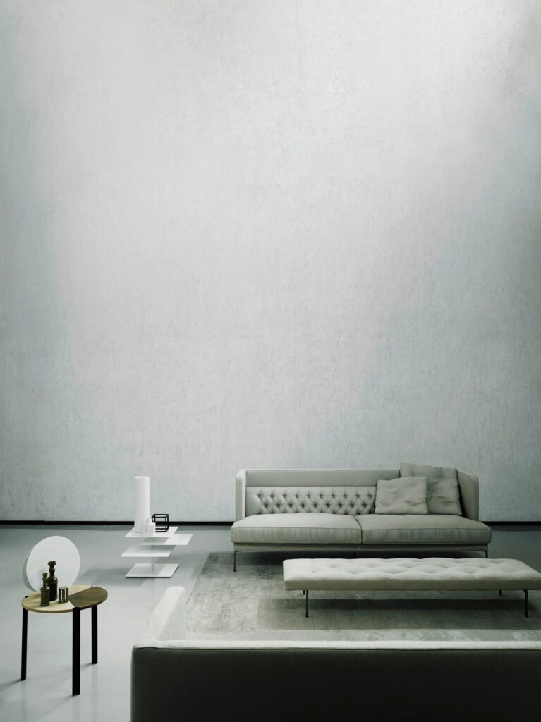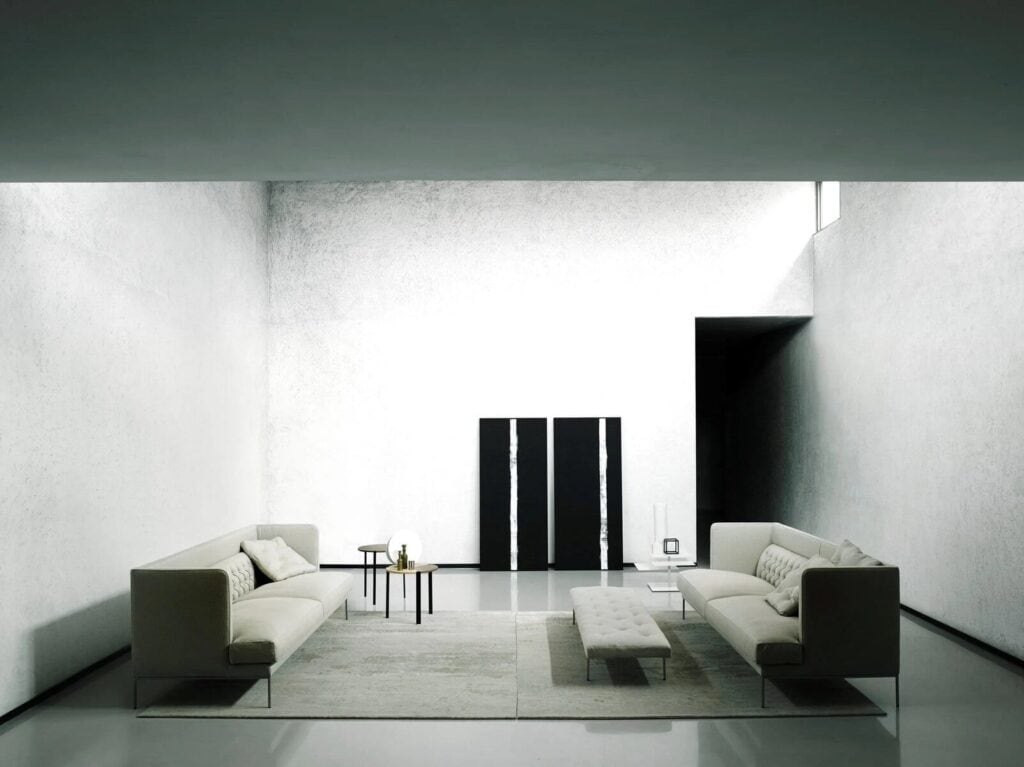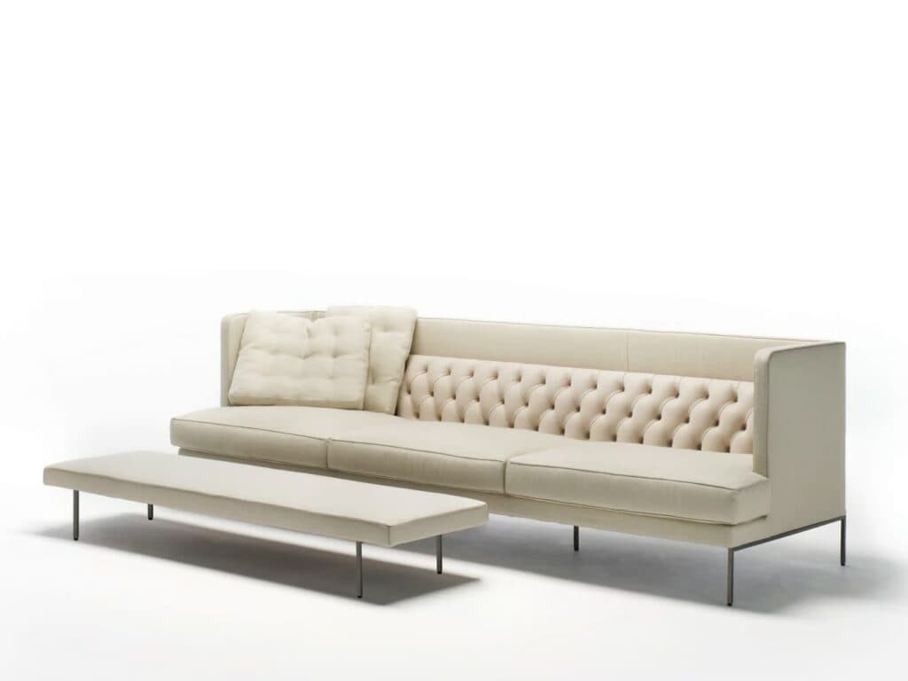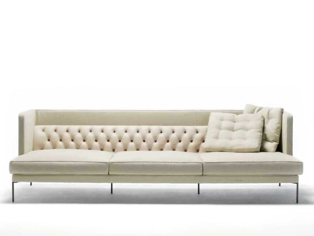 Strukturpolsterung aus Polyurethanschaum mit differenzierter Dichte und Bezug aus geharztem Polyestervlies, das auf einen Polyamidsamtträger geklebt ist. Lendenwirbelstütze in der Rückenlehne mit mehrschichtigem Rahmen, gepolstert mit Polyurethanschaum unterschiedlicher Dichte. "Capitonné" mit nicht abnehmbarem Bezug aus Leder oder Stoff. Sitzkissen aus vorgewaschenen und sterilisierten Gänsedaunen, in getrennten Fächern abgesteppt, mit Polyurethanschaumeinlage unterschiedlicher Dichte. Zusätzliche lose gesteppte Kissen, erhältlich in zwei Grössen (50x50cm oder 60x60cm), mit gestepptem Stoff- oder Lederbezug, beide vollständig abnehmbar durch Reissverschlüsse.