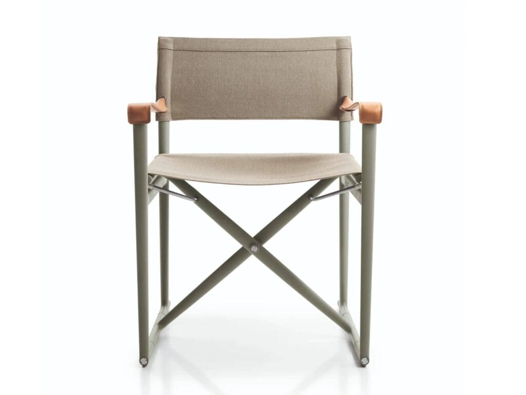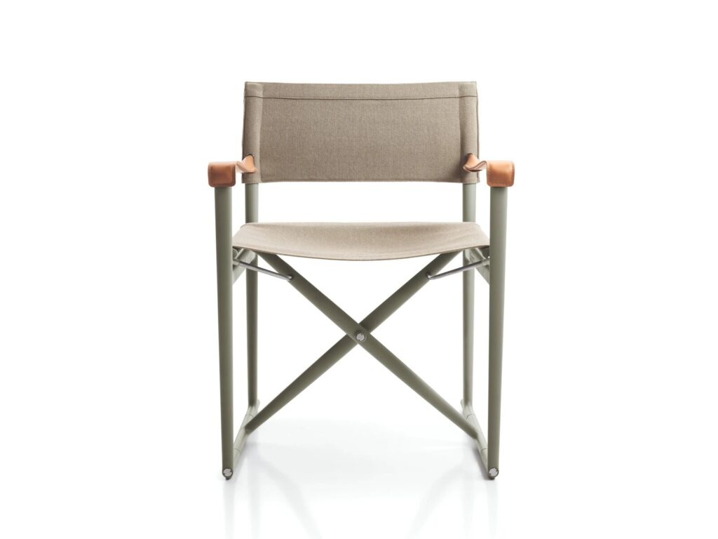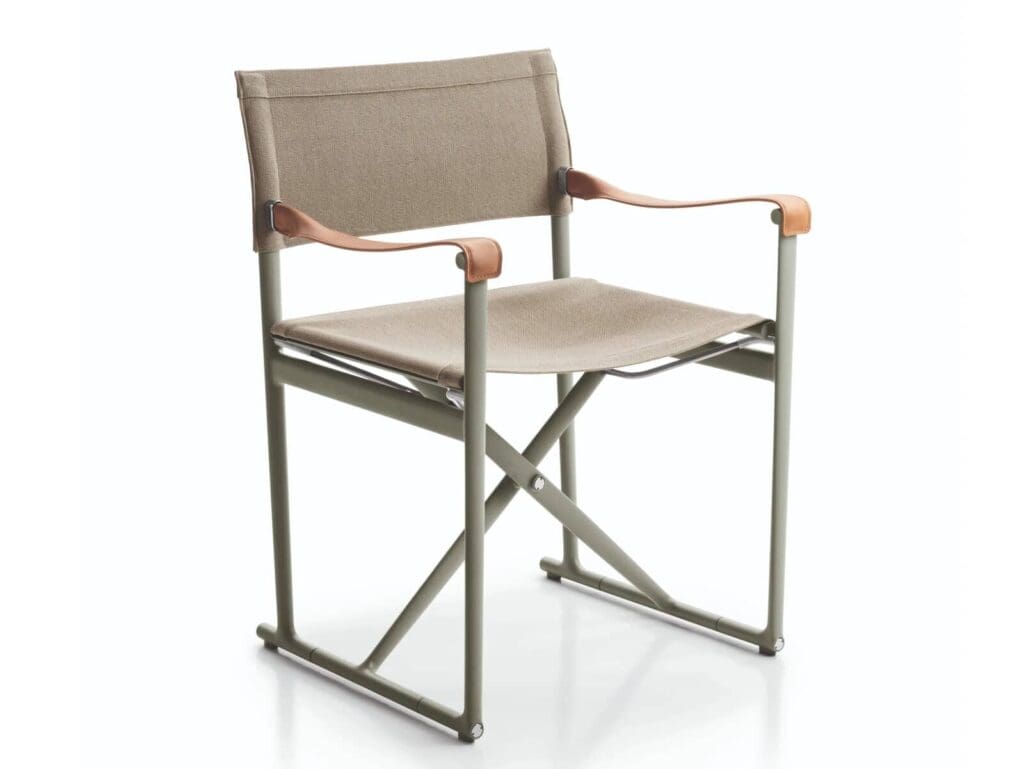 Ein klappbarer Regiestuhl, jetzt aus ecrufarbenem Segeltuch mit Armlehnen aus dickem Naturleder und einem Gestell aus Aluminiumdruckguss in den neuen Farben Ton und Salbei