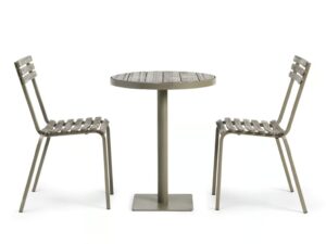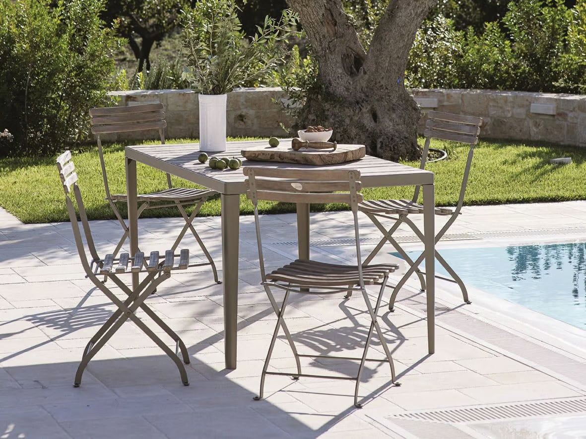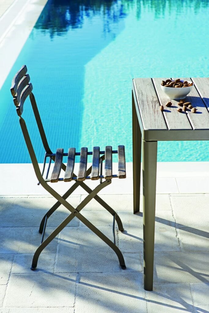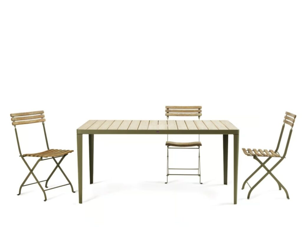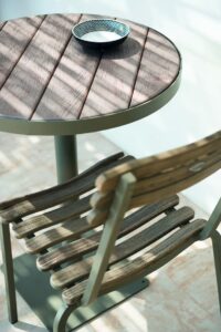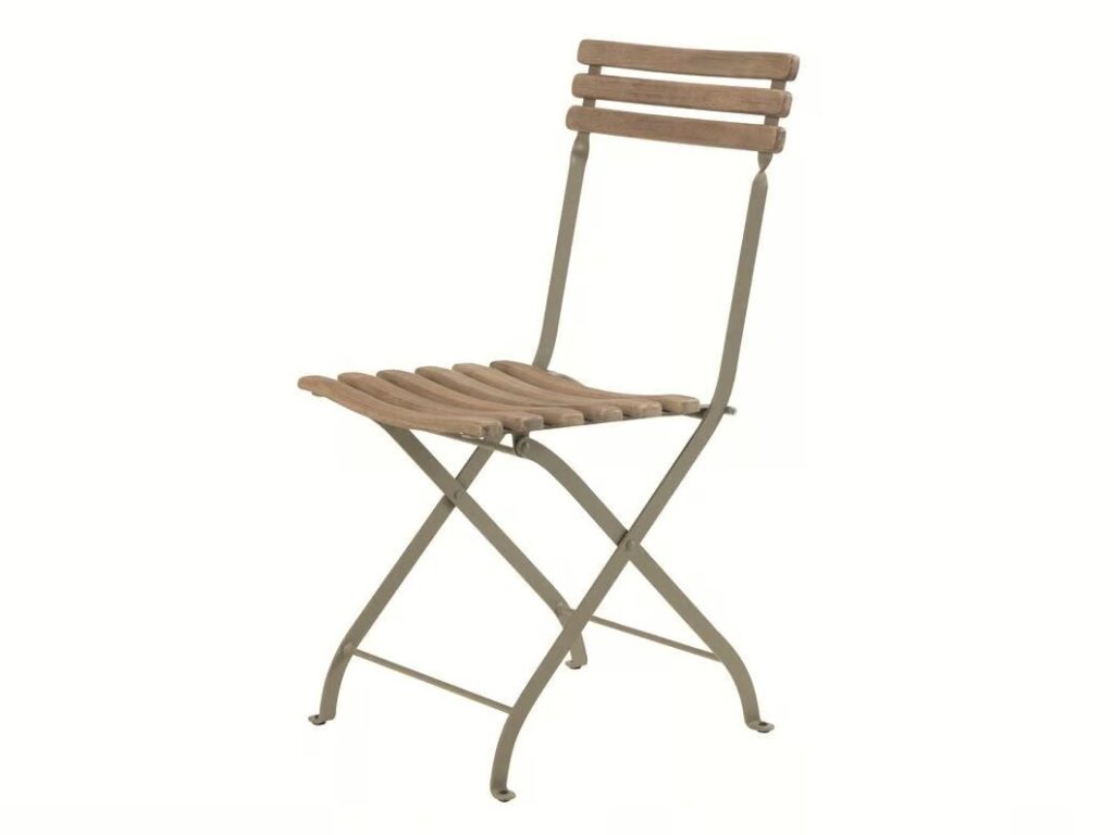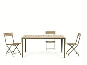 LAREN ist ein Stuhl aus Metall und gebeiztem Teakholz. Erhältlich in drei Versionen: stapelbar, klappbar, mit Armlehnen, hoher Hocker.