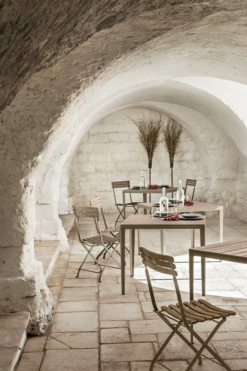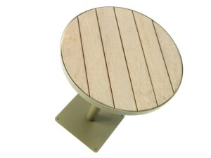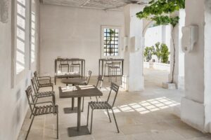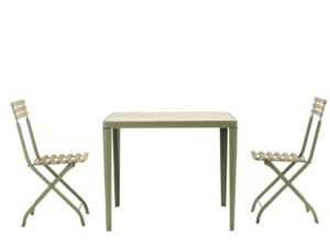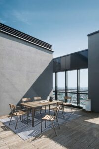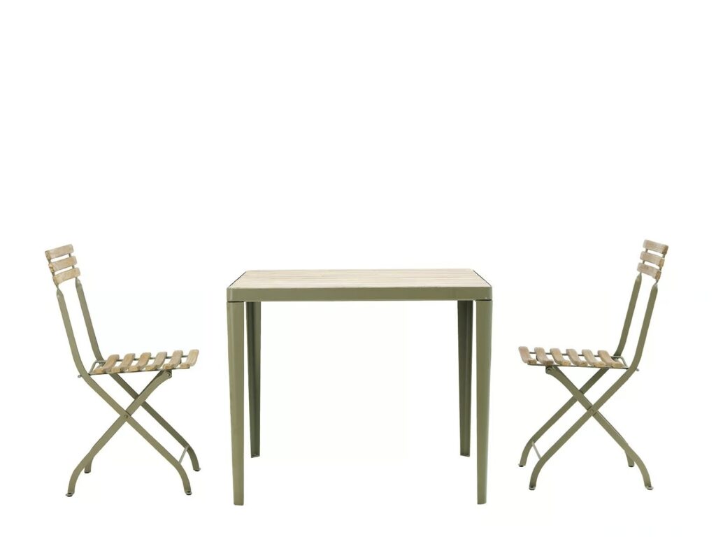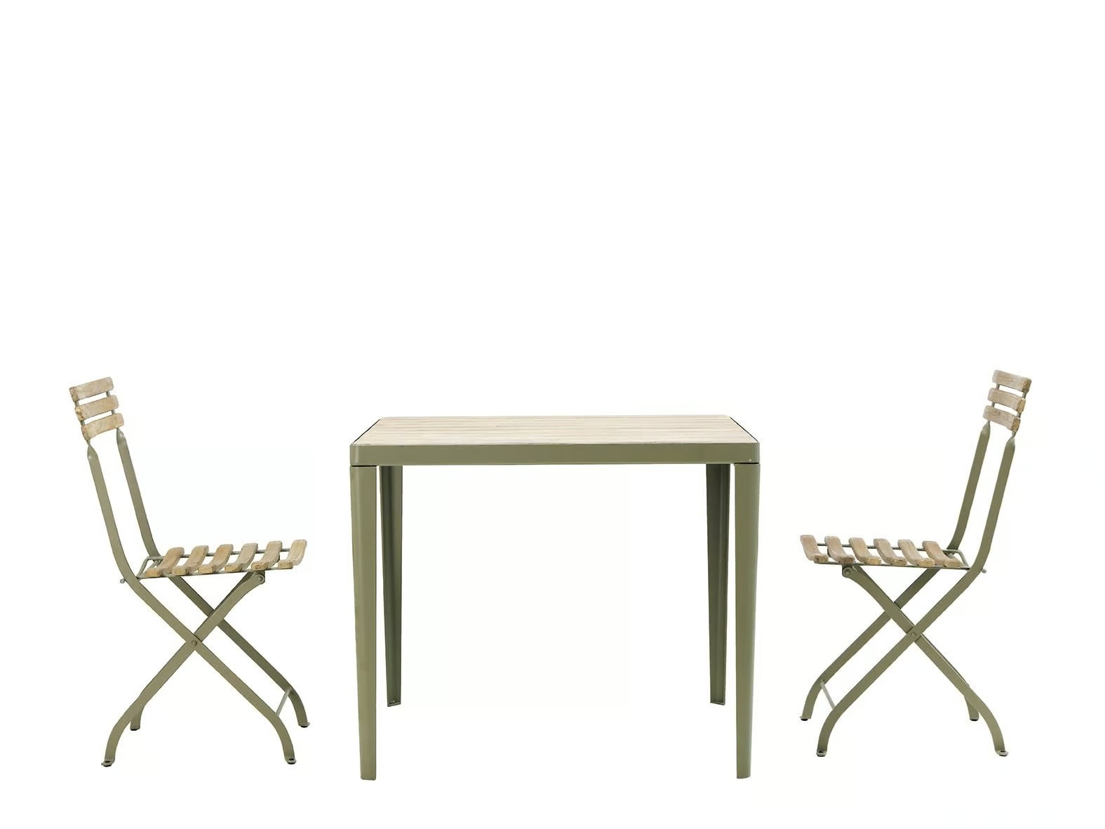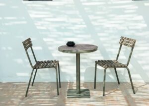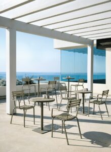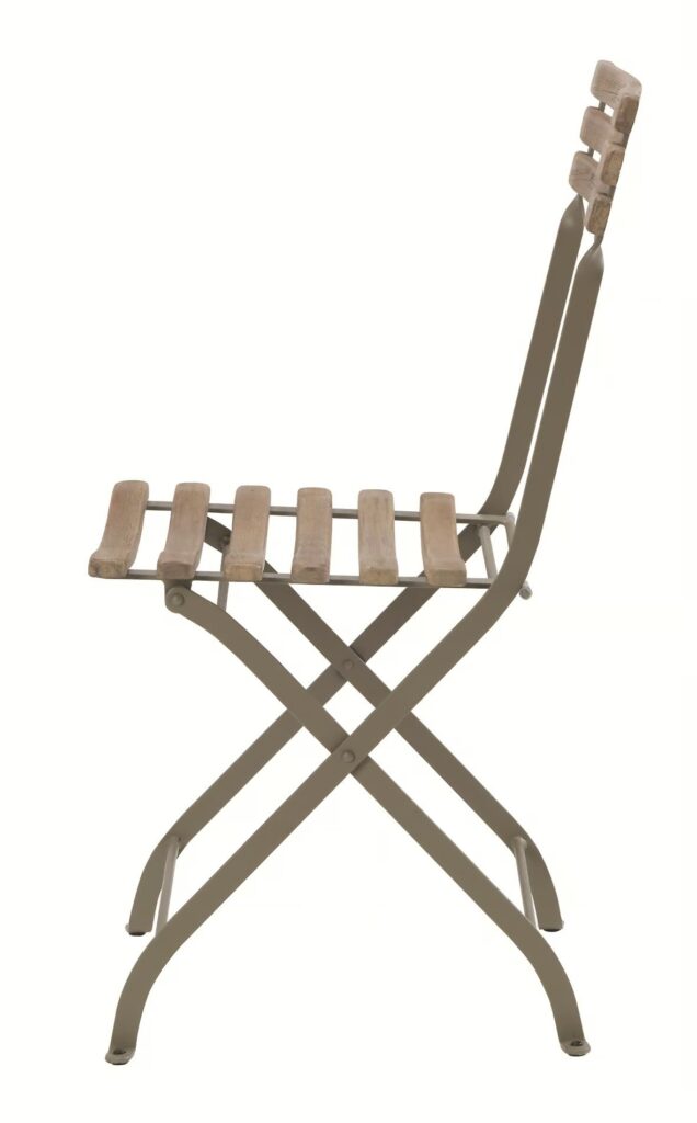 LAREN ist ein Stuhl aus Metall und gebeiztem Teakholz. Erhältlich in drei Versionen: stapelbar, klappbar, mit Armlehnen, hoher Hocker.