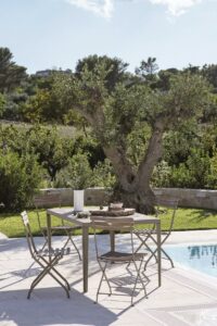 Grosse Kollektion aus Metallund Teakholz, bestehend aus Tischen und Sitzflächen für den privaten oder gewerblichen Gebrauch.