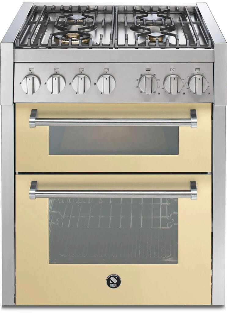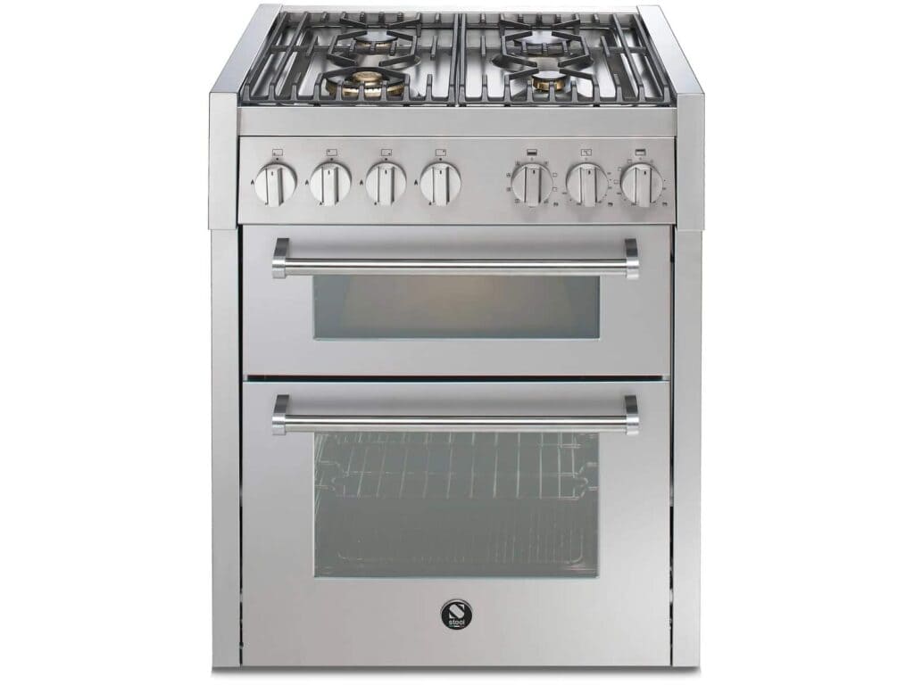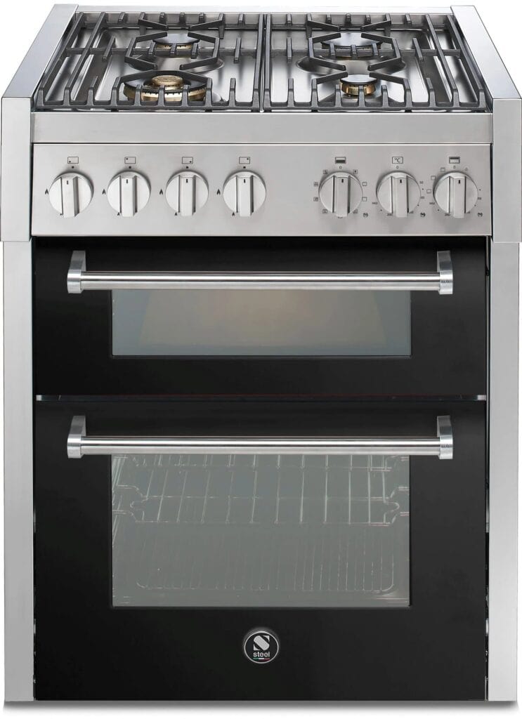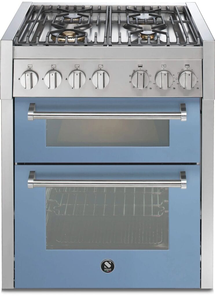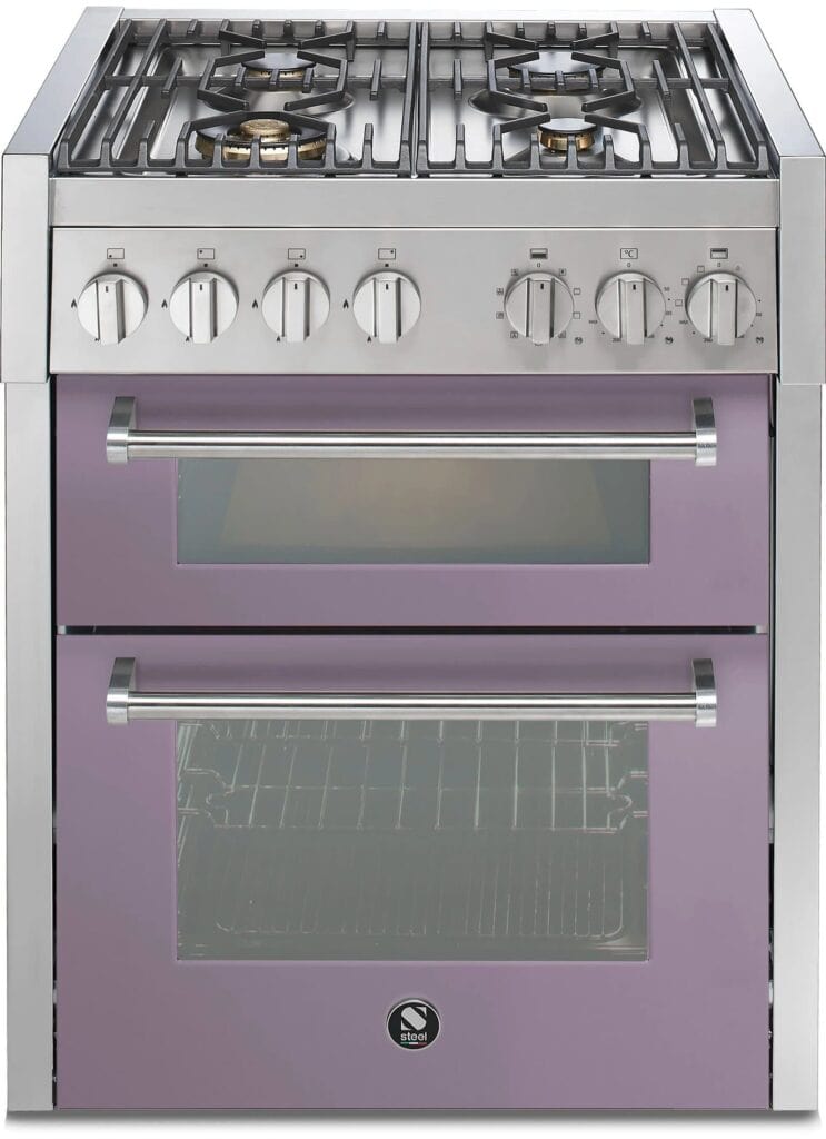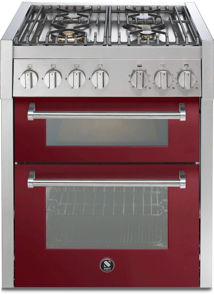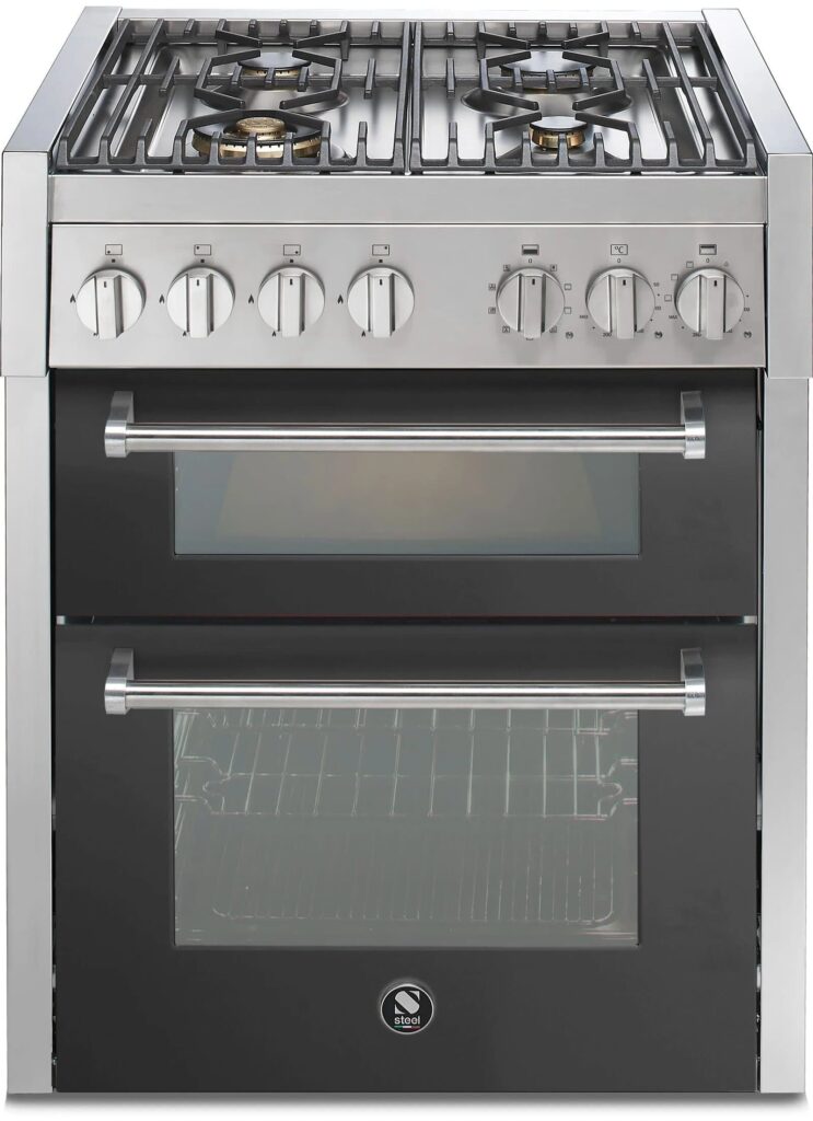 70 cm grosser Küchenblock mit 2 Kochfeldern, einem 60 cm grossen kombinierten Dampfbackofen, einem 30 cm grossen traditionellen Backofen und einem Pizzaofen.
