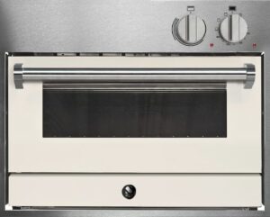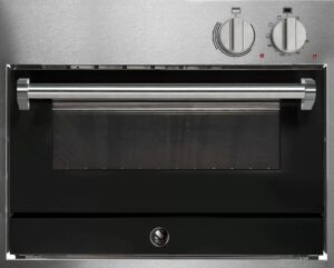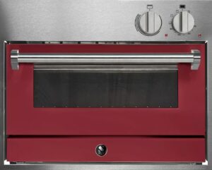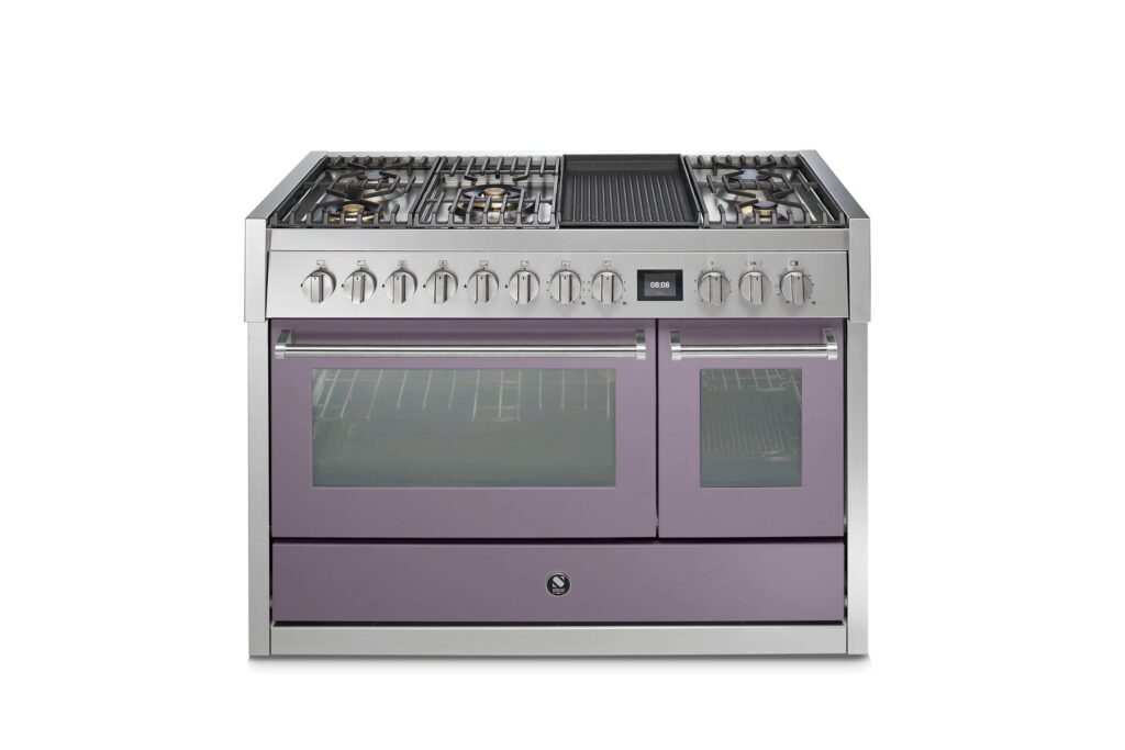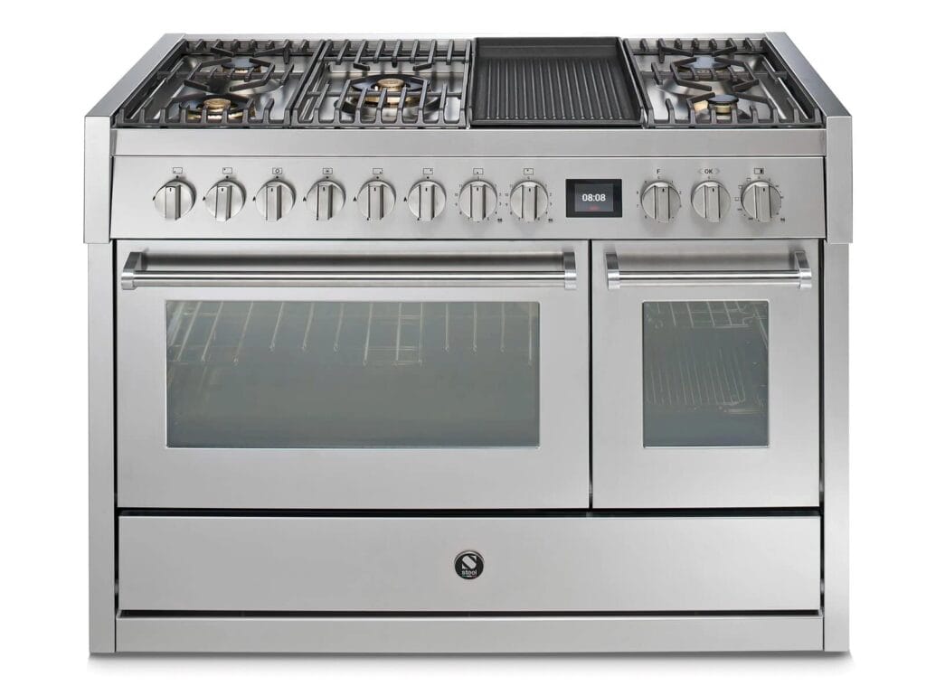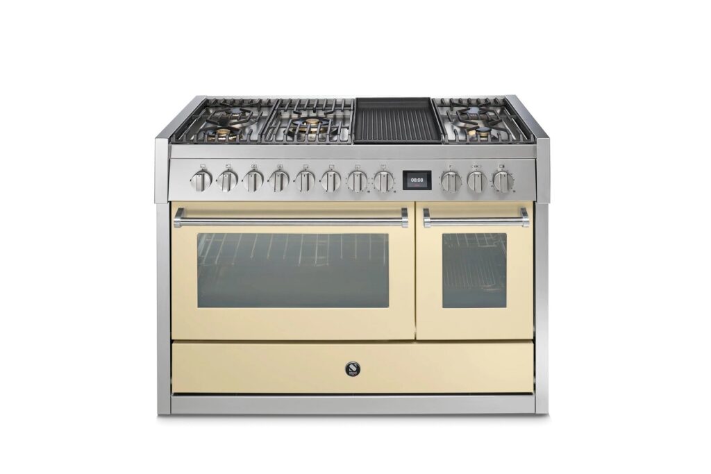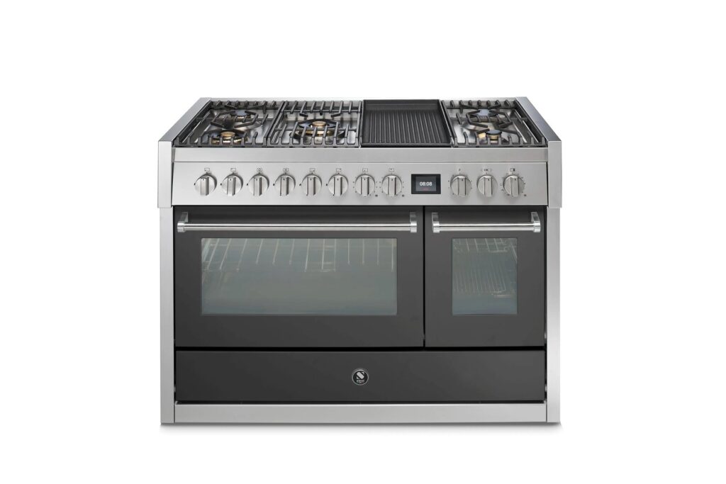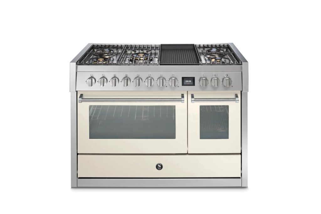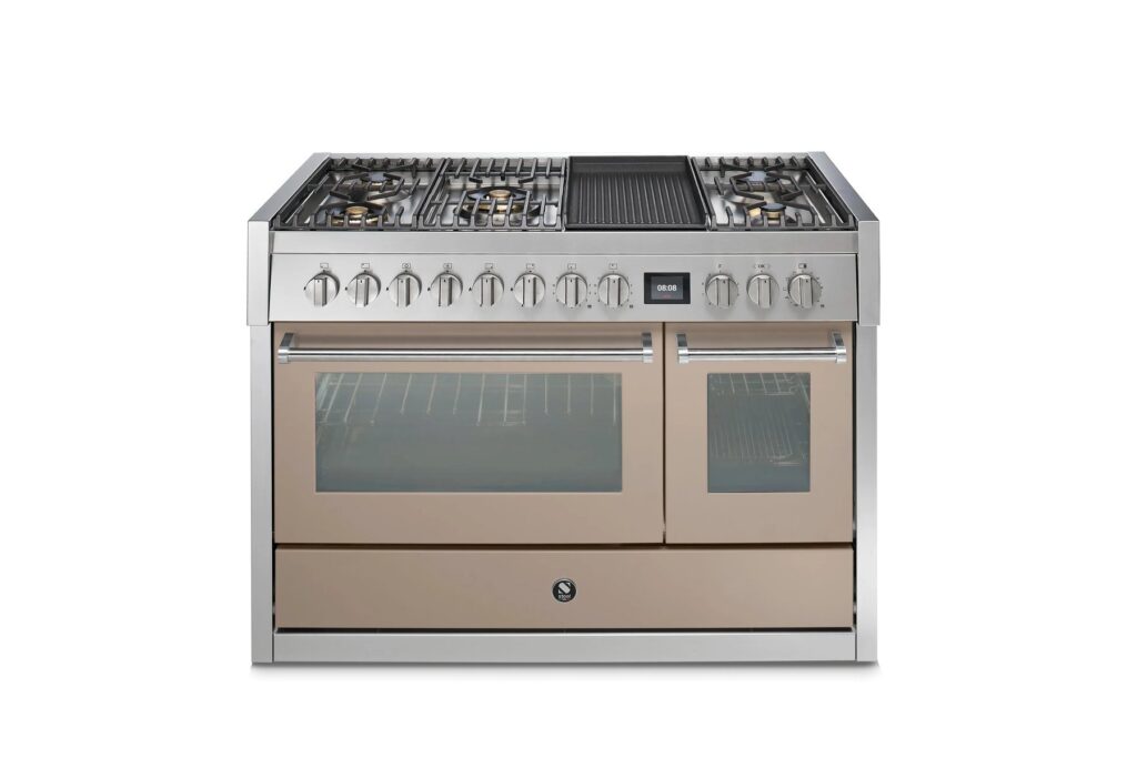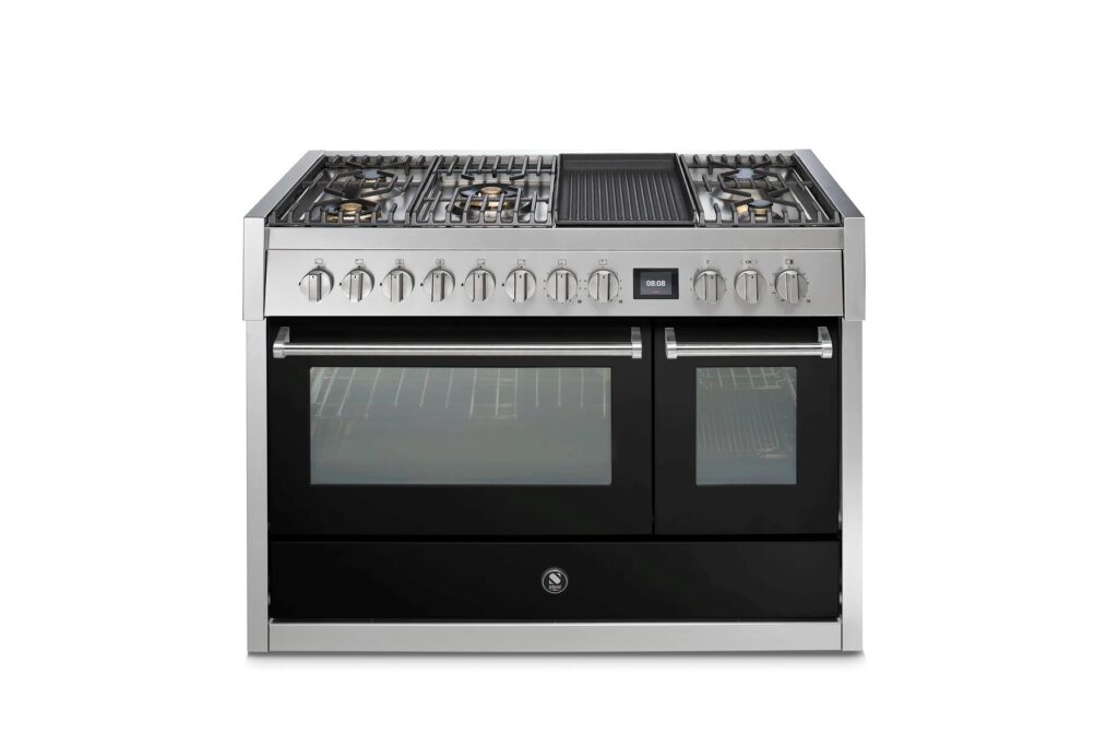 Küchenblock 120 cm mit 5 Kochfeldern, einem kombinierten Dampfbackofen 90 cm und einem traditionellen Backofen 30 cm.