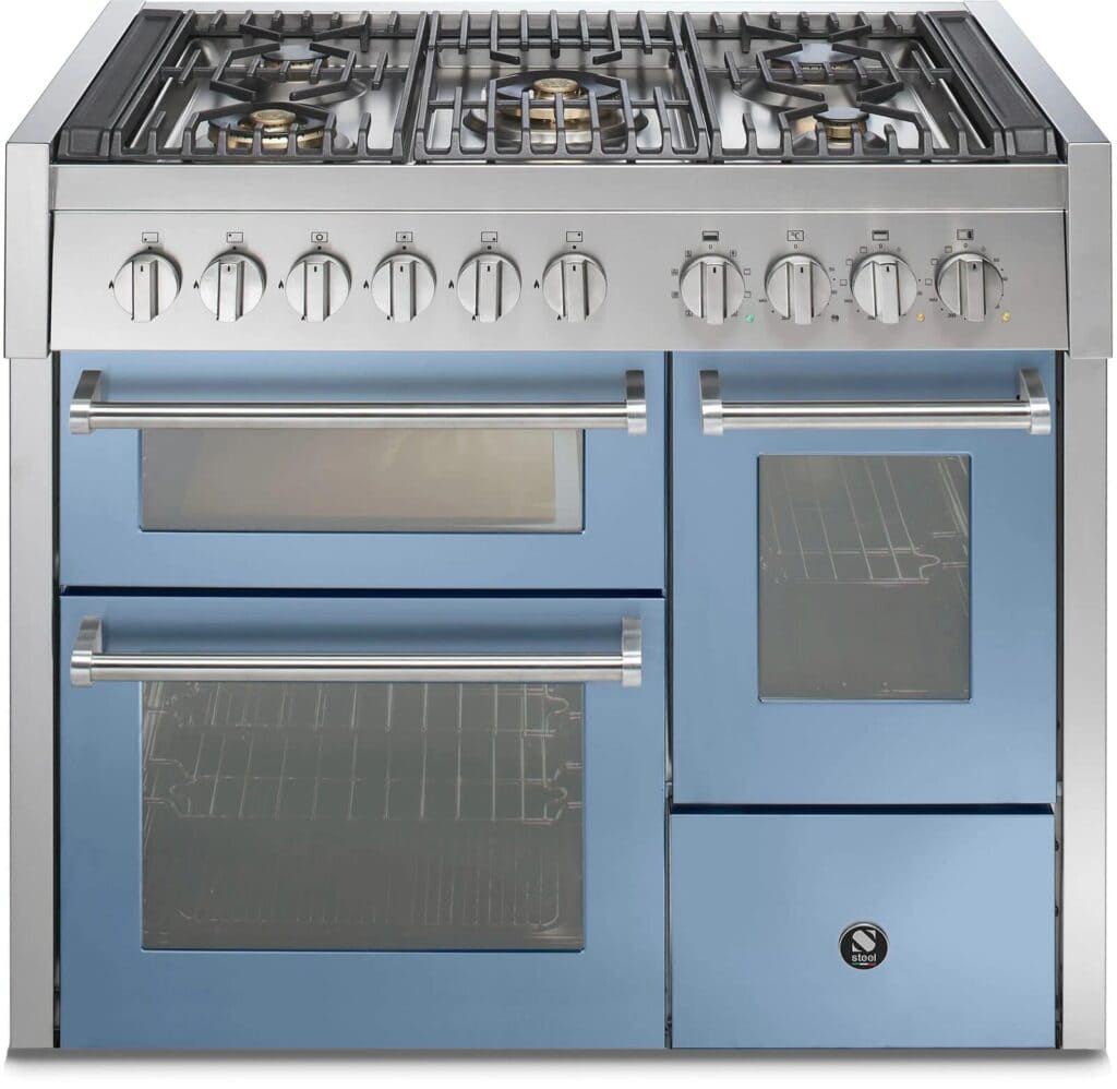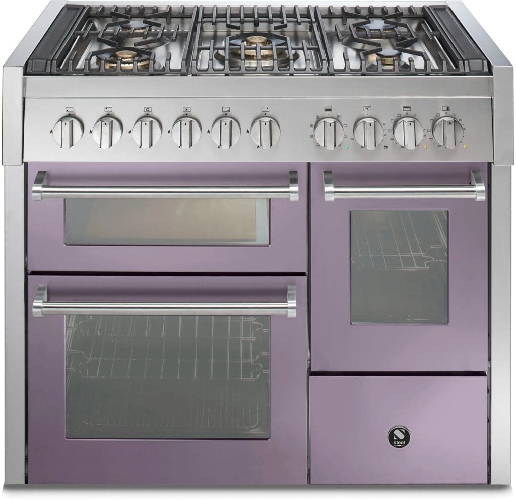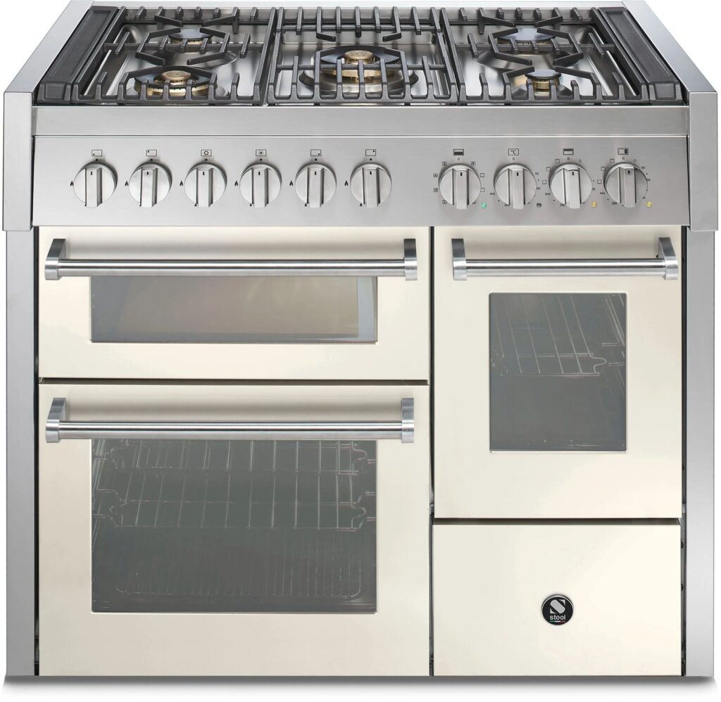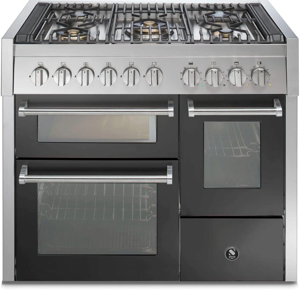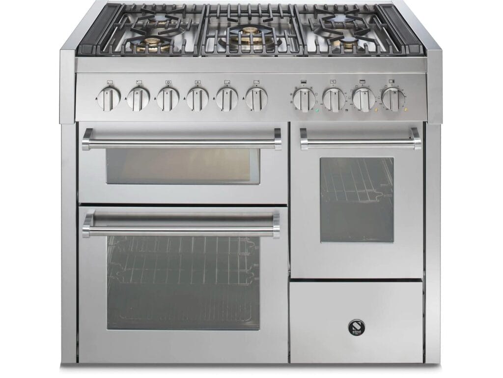100 cm langer Küchenblock mit 5 verschiedenen Kochfeldern, einem 60 cm grossen kombinierten Dampfbackofen, einem 30 cm grossen traditionellen Backofen und einem Pizzaofen.