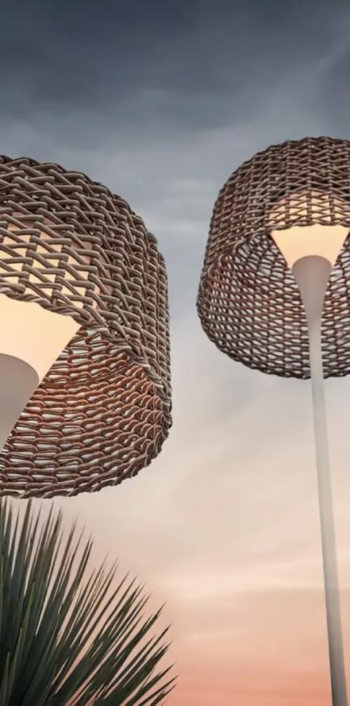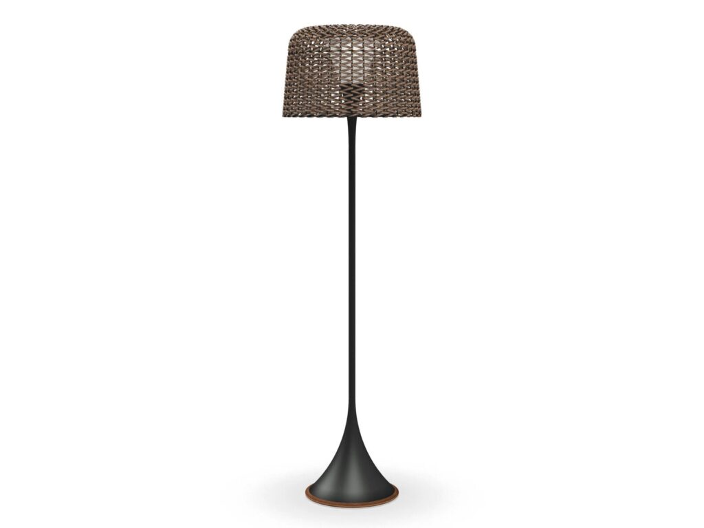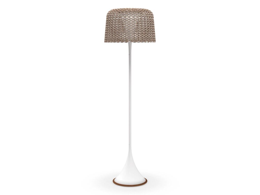 MESH - LED-Stehleuchte aus Aluminium und Weidengeflecht. Gestell aus naturbelassenem Teakholz und pulverbeschichtetem Aluminium. Geflochtener Schirm aus Allwetterweide. Solar- und netzbetriebene, wiederaufladbare LED-Leuchteinheit. Funkfernbedienung mit 8 Lichtleistungsstufen. Arbeitsabstand der Fernbedienung bis zu 35 m. Batterielebensdauer von ca. 8 Stunden bei maximaler Lichteinstellung.