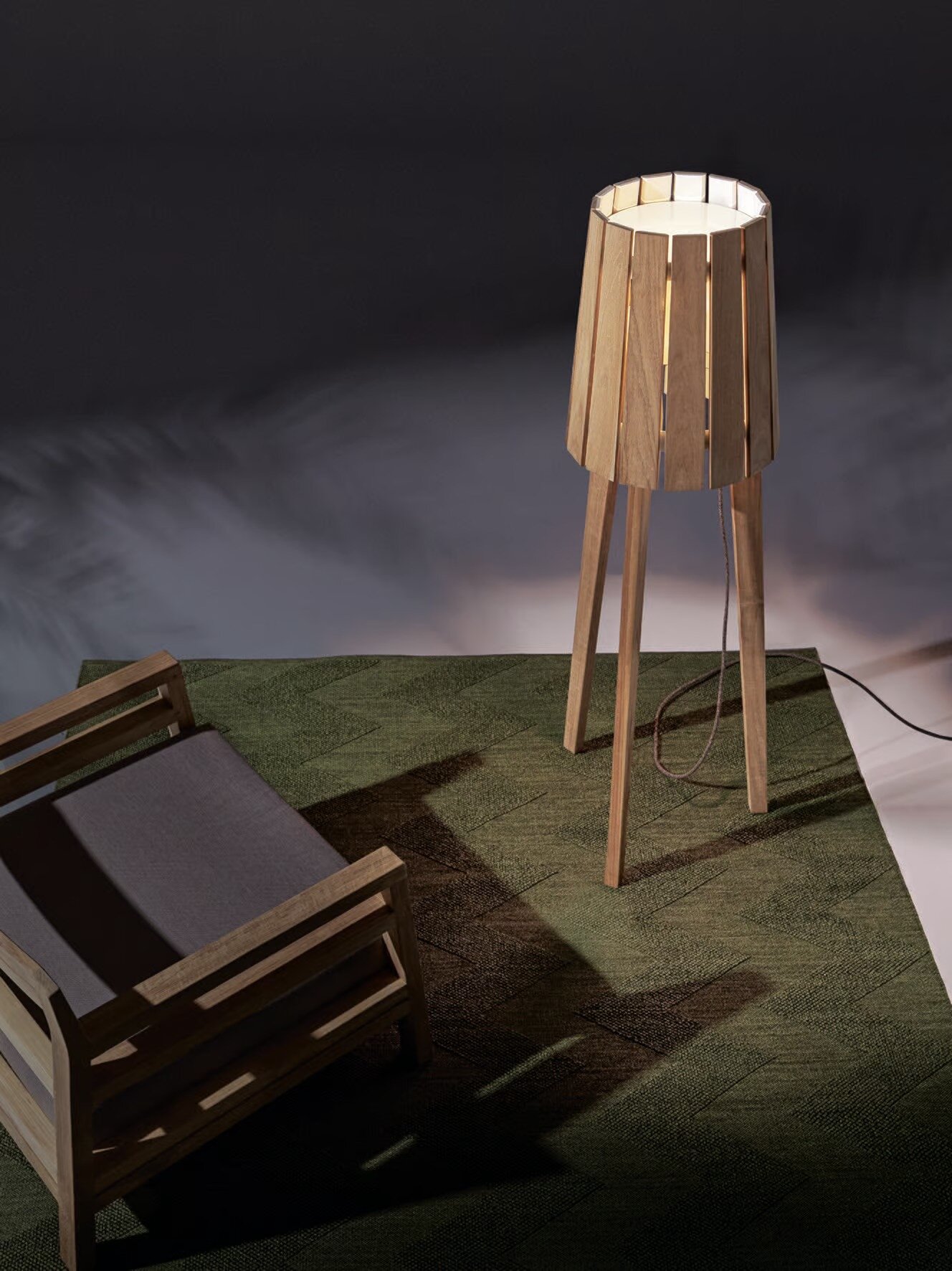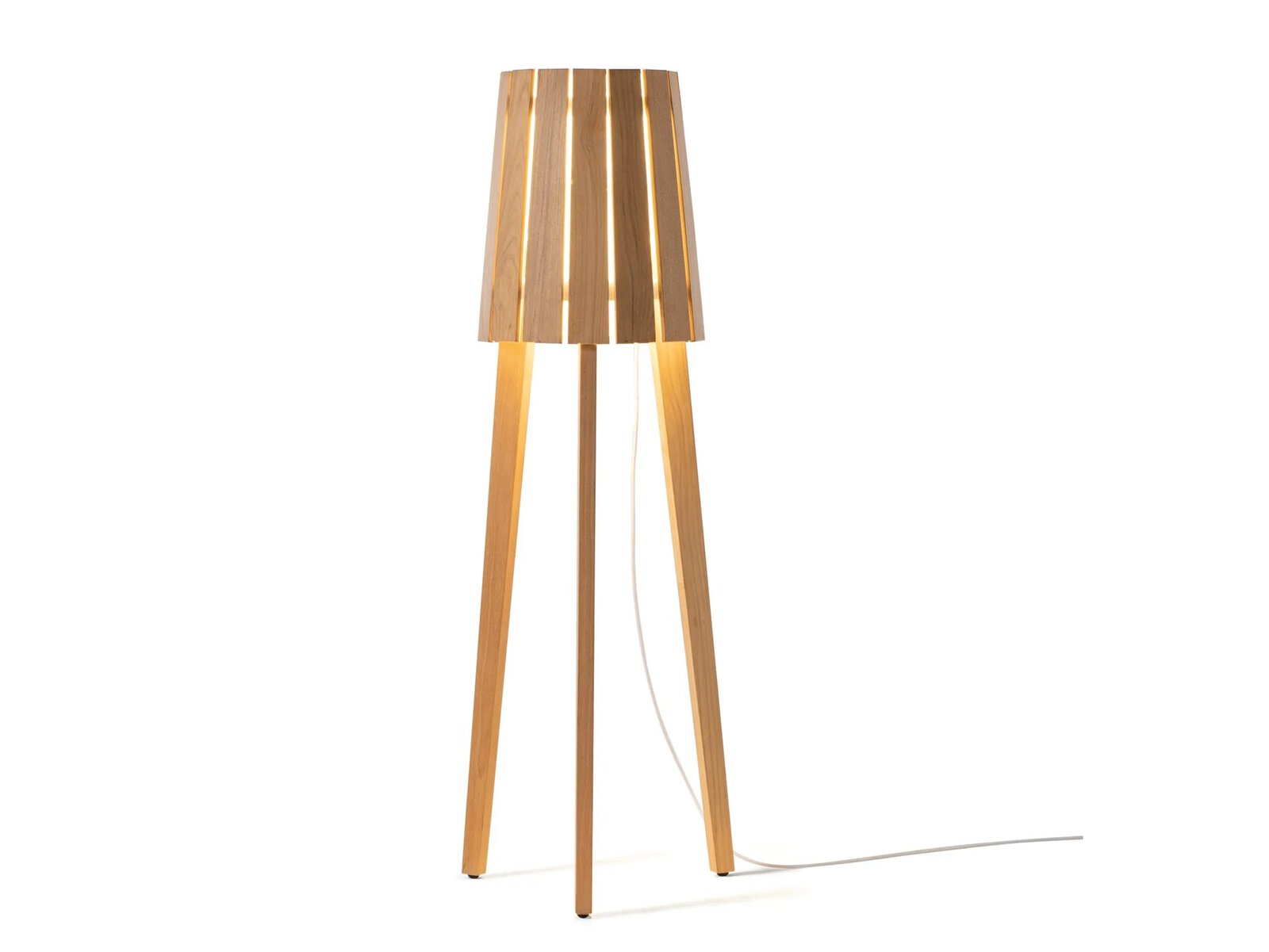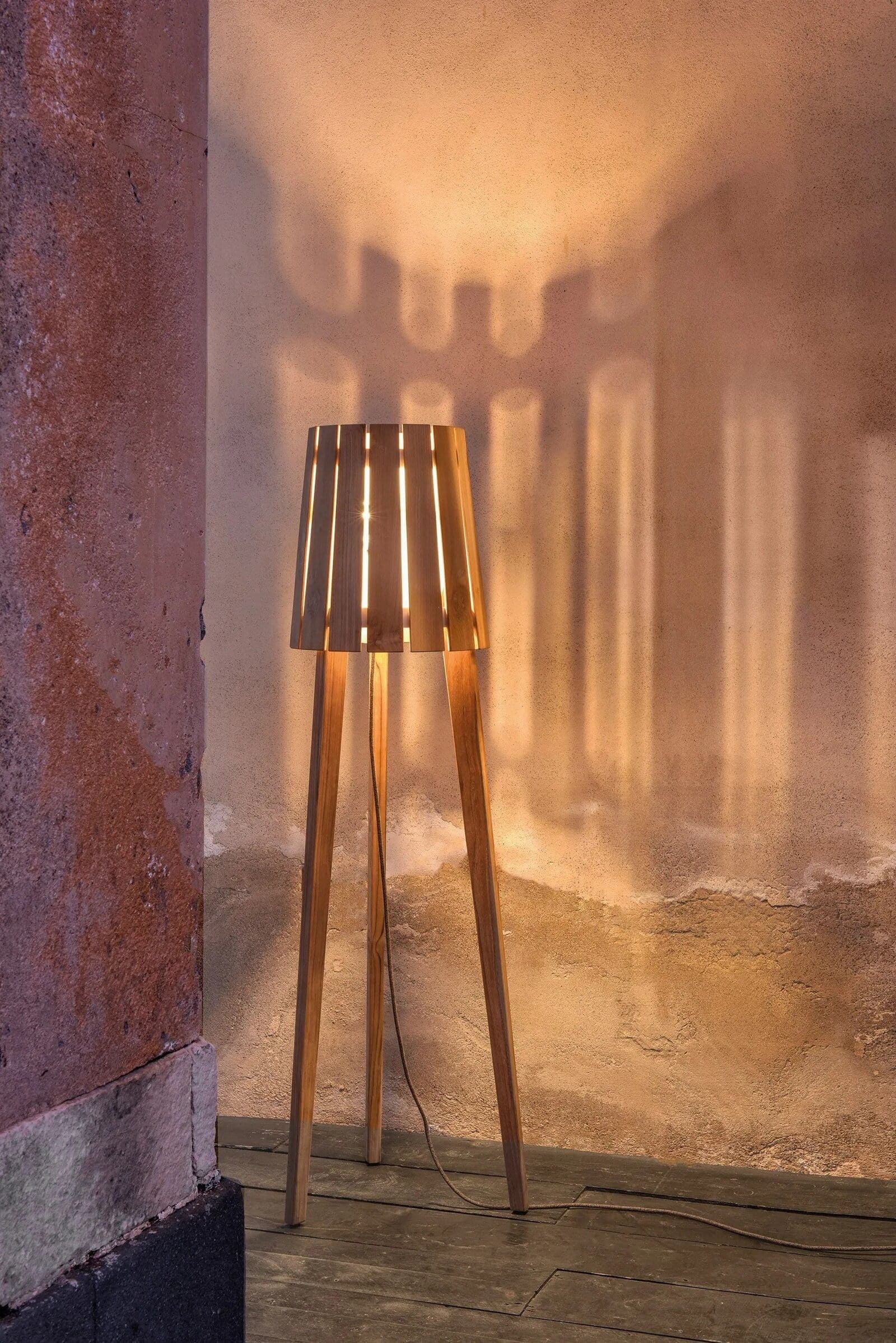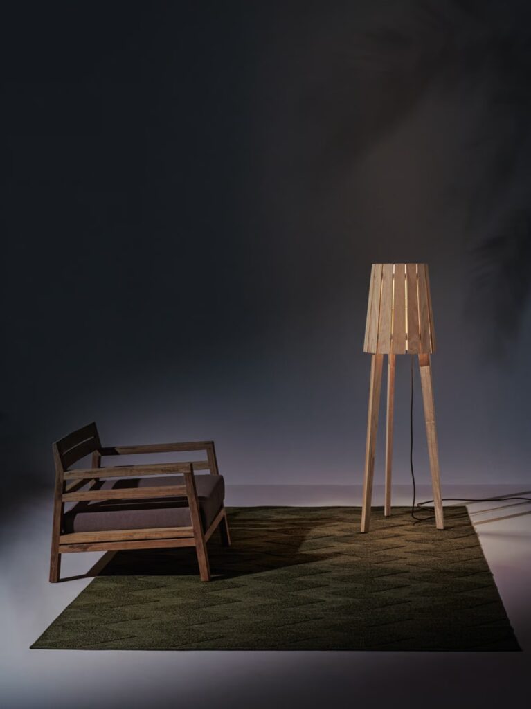 Woody ist eine Stehleuchte aus natürlichem Teakholz.