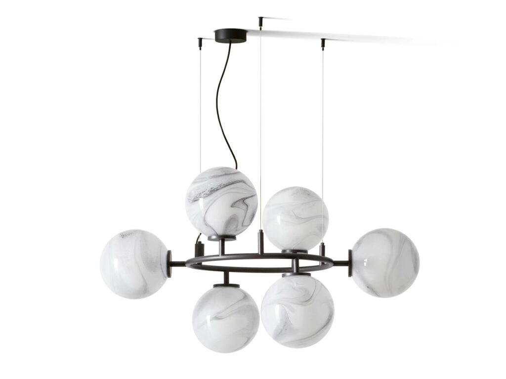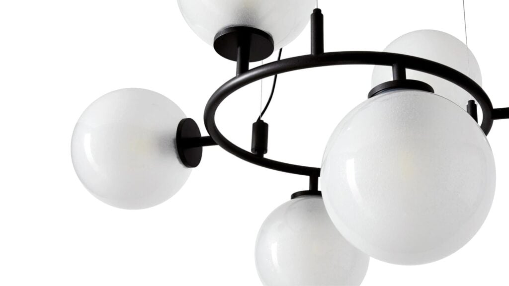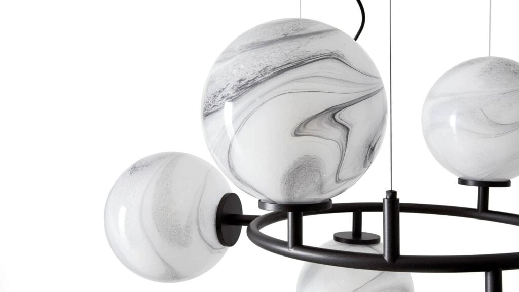 Constellation und Starburst erweitern die Verwendungsmöglichkeiten der Diffusoren der Lampen Bollicosa um neue Lösungen und lassen sich dabei durch die Himmelskörper inspirieren, die das Universum erhellen. Constellation ist ein kreisförmiger Deckenleuchter, der mit einem einzigen Durchmesser von 112 cm verfügbar ist, Starburst hingegen ist ein linearer Leuchter mit 120 cm Länge. Beide weisen eine schwarz lackierte Struktur auf und sind mit Gläsern mit weiss geätztem und weiss marmorisiertem Finish erhältlich.