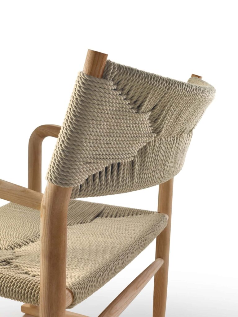 The unmistakable balance between architectural rigor and refined craftsmanship is embodied in materials designed to live outdoors: the solid iroko wood structure, worked with the expertise that defines Flexform’s manufacturing tradition, contrasts with the lightness of the seat and backrest in handwoven polypropylene rope, available in a palette of sophisticated hues.