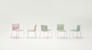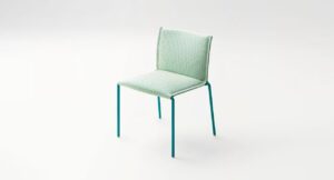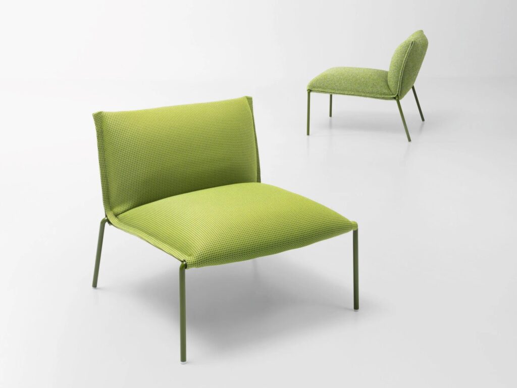 Mae is a lounge chair. Frame in AISI 304 stainless steel painted matt or glossy, springing on elastic straps for seat and backrest, plastic tips. Removable and removable mattress in polyester fibre, polyurethane insert, fixed internal lining in water-repellent polyester. Removable external covering available in a selection of outdoor fabrics from the collection.