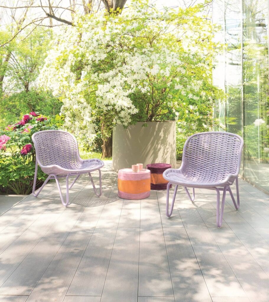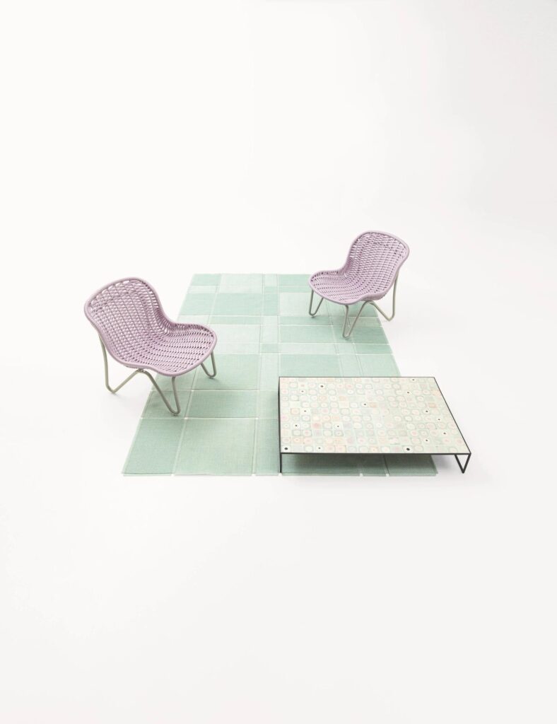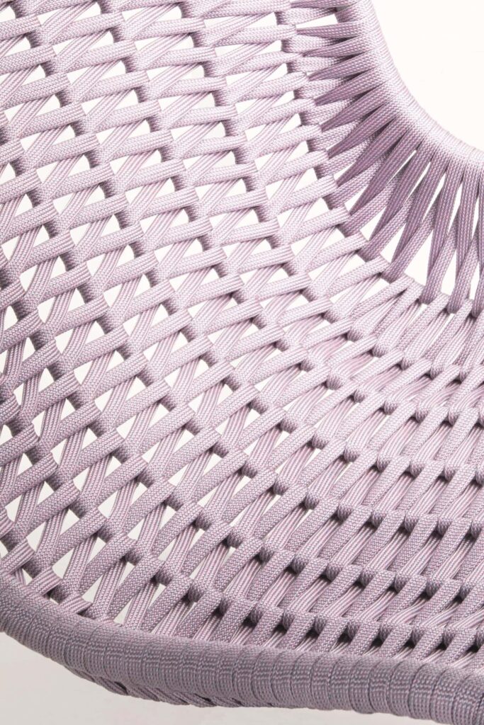 Die Serie Jardín besteht aus einem Sessel, einem niedrigen Sessel und einem Liegestuhl. Das ursprüngliche Geflecht wurde mit dem einzigartigen Twiggy-Seil aktualisiert, das von Hand auf moderne, gebogene Aluminiumrahmen und polierten Lack geflochten wird.