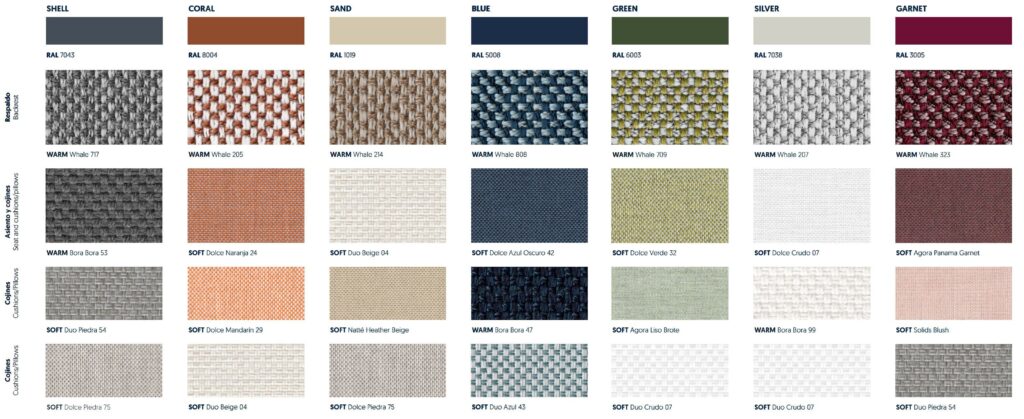 Voreingestellte Farb- und Stoffkombinationen: Koralle, Sand, Muschel, Blau, Grün, Silber, Granat