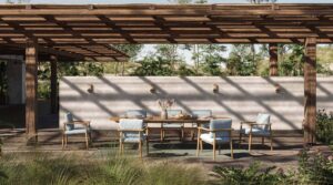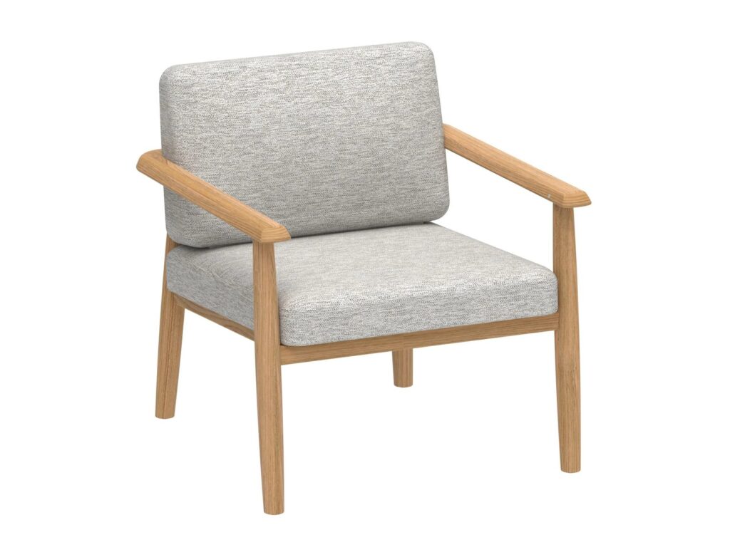 Mambo ist ein Gartensessel mit Holzgestell und Polsterung mit Stoffbezug.