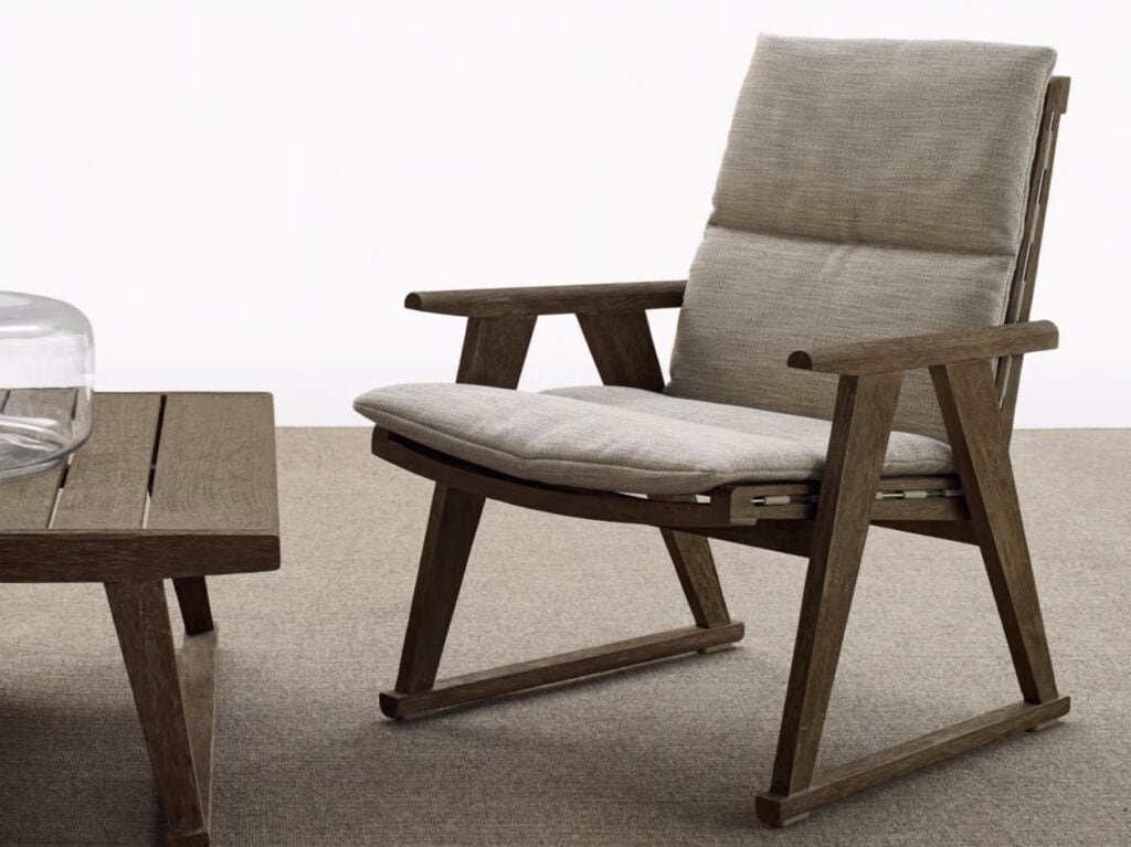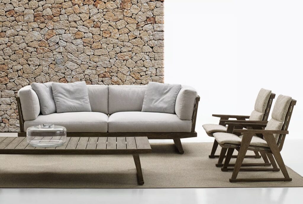 Gio, entworfen von Antonio Citterio, ist die neue Serie mit einem zeitgenössischen klassischen Akzent, die dem Leben im Freien gewidmet ist. Es handelt sich um eine komplette Reihe von Sofas, Endstücken, Chaiselongues, Liegen, Sesseln, Stühlen, Tischen und Ergänzungen, die aus massiven Teakholzstrukturen mit einer speziellen antikgrauen Oberflächenbehandlung entwickelt wurden, die dem Holz einen besonders lebendigen Aspekt und eine silbergraue Reflexionsqualität verleiht.
