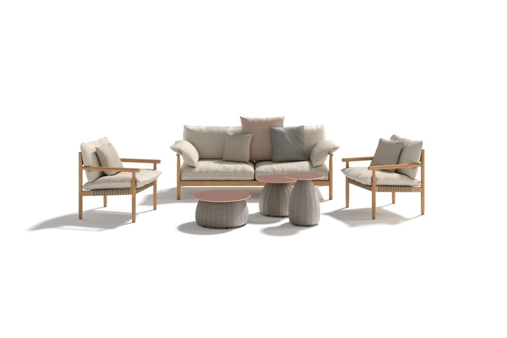 Die renommierten britischen Designer Edward Barber und Jay Osgerby entwarfen TIBBO für eine Zeit, in der Innen- und Aussenbereiche immer mehr miteinander verschmelzen. TIBBO ist die erste Teakholz-Kollektion von DEDON und vereint sorgfältige Handwerkskunst, überragenden Komfort und bemerkenswerte Leichtigkeit in einem Design, das unverwechselbar, elegant und rein ist. TIBBO besteht aus Ess- und Loungeelementen aus Teakholz, Textilien und gewebten Fasern und vermittelt ein aussergewöhnlich reiches und luxuriöses Aussehen und Gefühl. TIBBO zeichnet sich durch eine gewisse architektonische Strenge aus, sowohl in der Konstruktion als auch in den Proportionen. Die Rationalität des Designs wird jedoch durch die Wärme des Holzes, den Komfort der Kissen, das natürliche Aussehen der speziell entwickelten Faser und die segelartige dreidimensionale Kurve der geformten Rückenlehnen ausgeglichen. Die Kollektion wird in Handarbeit aus hochwertigem Teakholz gefertigt, das aus nachhaltigen Plantagen stammt. Hochwertiges Teakholz bietet eine hohe Witterungsbeständigkeit und Haltbarkeit auch unter extremen Bedingungen. In Innenräumen behält TIBBO seinen goldenen Farbton. Im Freien, wenn es unbehandelt bleibt, erhält es auf natürliche Weise eine silbergraue Patina, die, so die Designer, „dem Design eine weitere Ebene der Qualität verleiht“.