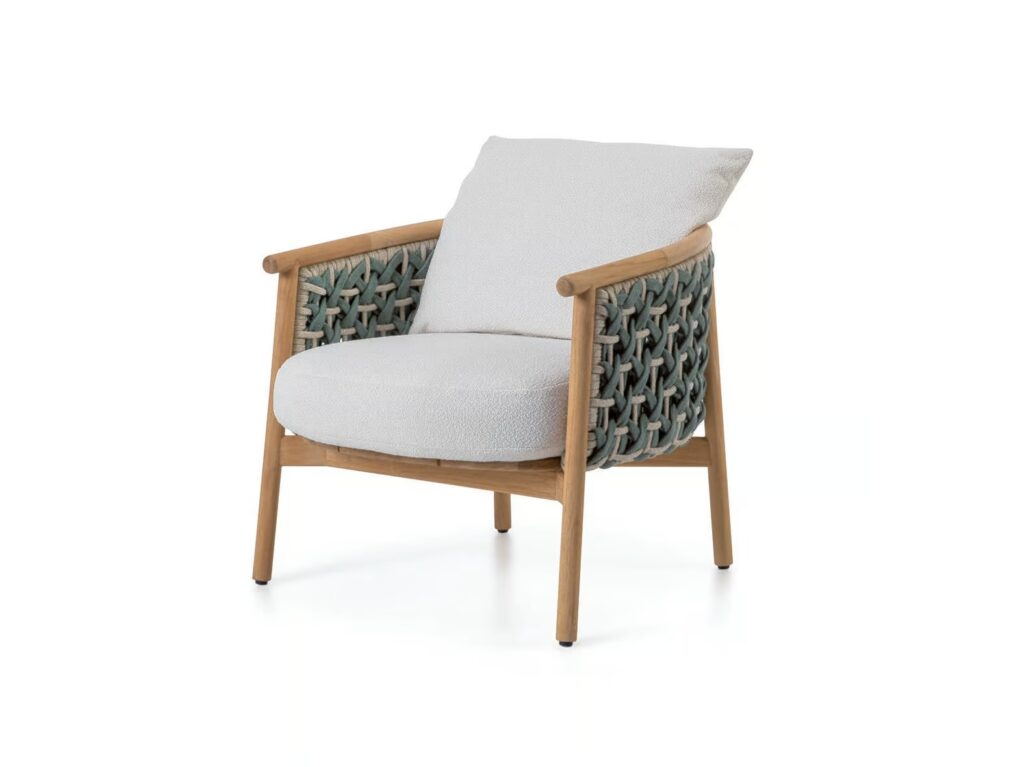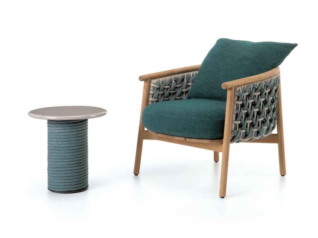 The weave that forms the seat, in addition to the Laguna blue and light grey rope variants, is now available in a monochromatic version in light grey rope. This new option extends to all lounge and dining seating.