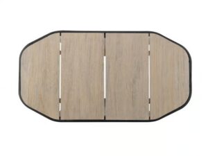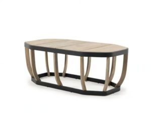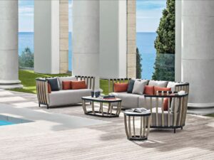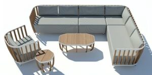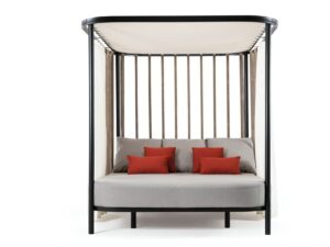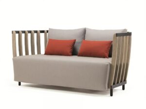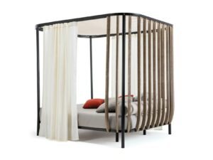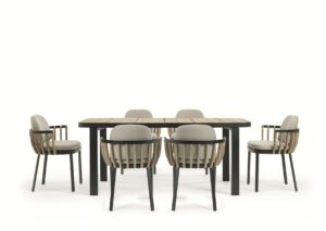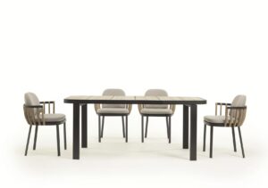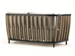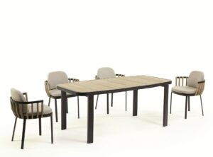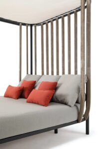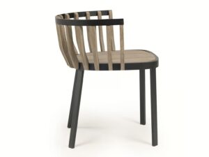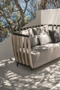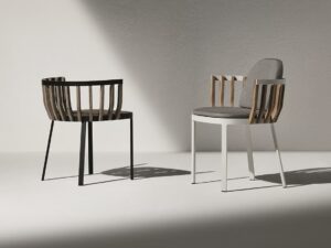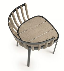 aus Teakholz, die an einer Struktur aus Aluminium befestigt sind und bequeme Sitzflächen verschiedener Art und Grösse schaffen, die sowohl im Freien als auch Indoor verwendet werden können. Nach dem Debüt mit einer Gartenschaukel von doppelter Struktur, eingehüllt in ein Tuch, erweitert sich nun das Projekt und wird durch einen grossen Tisch ergänzt, der das Metall mit den Leisten aus Teakholz verbindet, und durch einen neuen Dining-Lehnstuhl, bequem, praktisch und kohärent mit dem Design der gesamten Kollektion, dank der gleichen Wechselspiele.