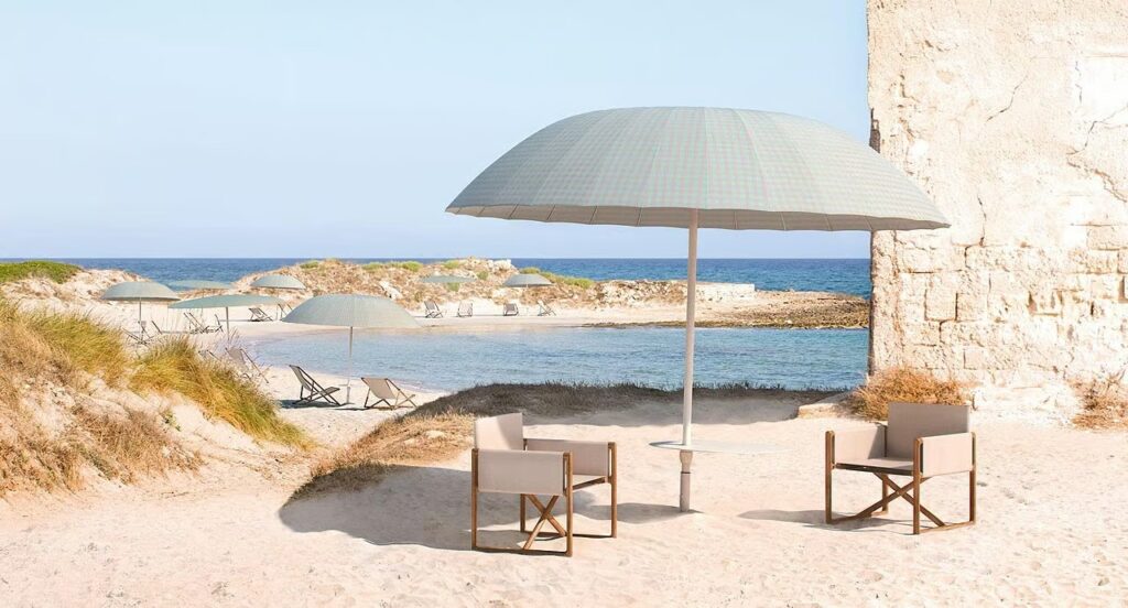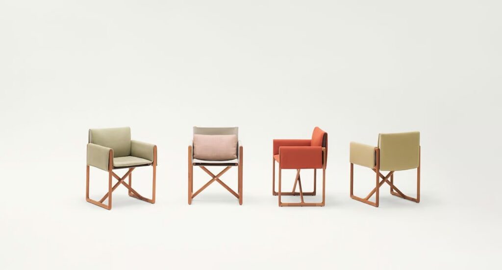 Portofino ist eine neue Sitzmöbelkollektion, bestehend aus einem Stuhl mit Armlehnen, einem Liegestuhl, einem Sessel und einem Hocker mit faltbarem Gestell aus Robinienkernholz; der abnehmbare Bezug ist in allen Outdoor-Stoffen der Kollektion erhältlich.