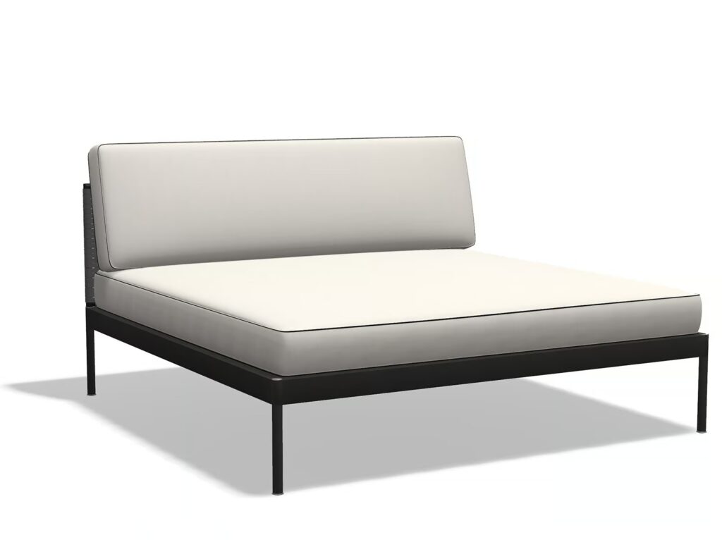 Die Verflechtung der Stoffe, das Netz der Garne und der Strick der Polsterung, der das Metallrohr in einer strengen und formalen Kombination umschmeichelt, definieren die Oberflächen, die die Vertikalität und Horizontalität dieser Kollektion klar umreißen, die geschaffen wurde, um Designmöbel, auch für den Außenbereich, zu schaffen.