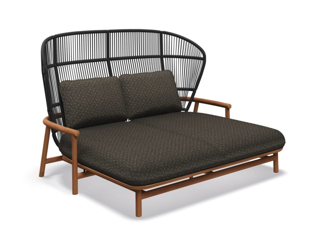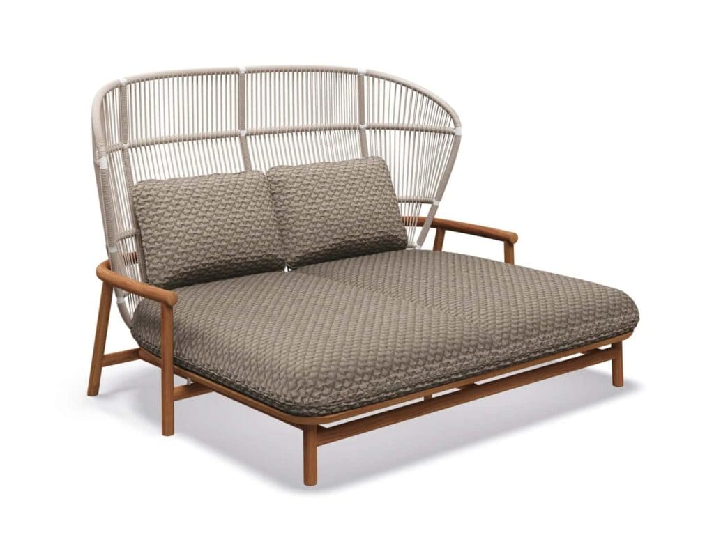 Inspiriert von den zarten Wedeln eines sich entfaltenden Farnblatts, hat die Fern-Kollektion von Sebastian Herkner eine an die Natur angelehnte Formensprache. Die umhüllende, geflochtene Rückenlehne aus Plantagen-Teakholz mit weichem Outdoor-Seil bietet Schutz und Komfort und ist an einem Rahmen aus Teakholz im typisch skandinavischen Stil befestigt, der die Konturen widerspiegelt und den Komfortaspekt unterstreicht.