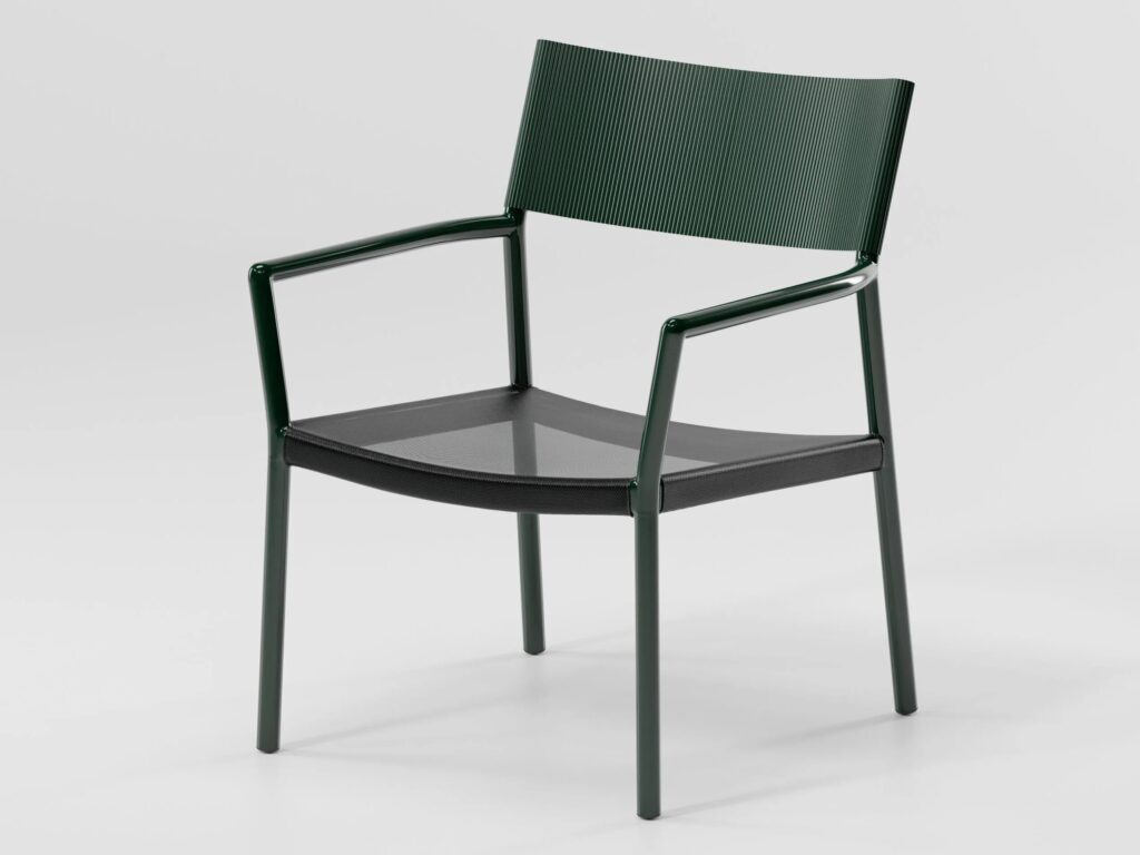Passage ist ein Sessel aus Aluminium mit Armlehnen und Sitzfläche aus Textilene.