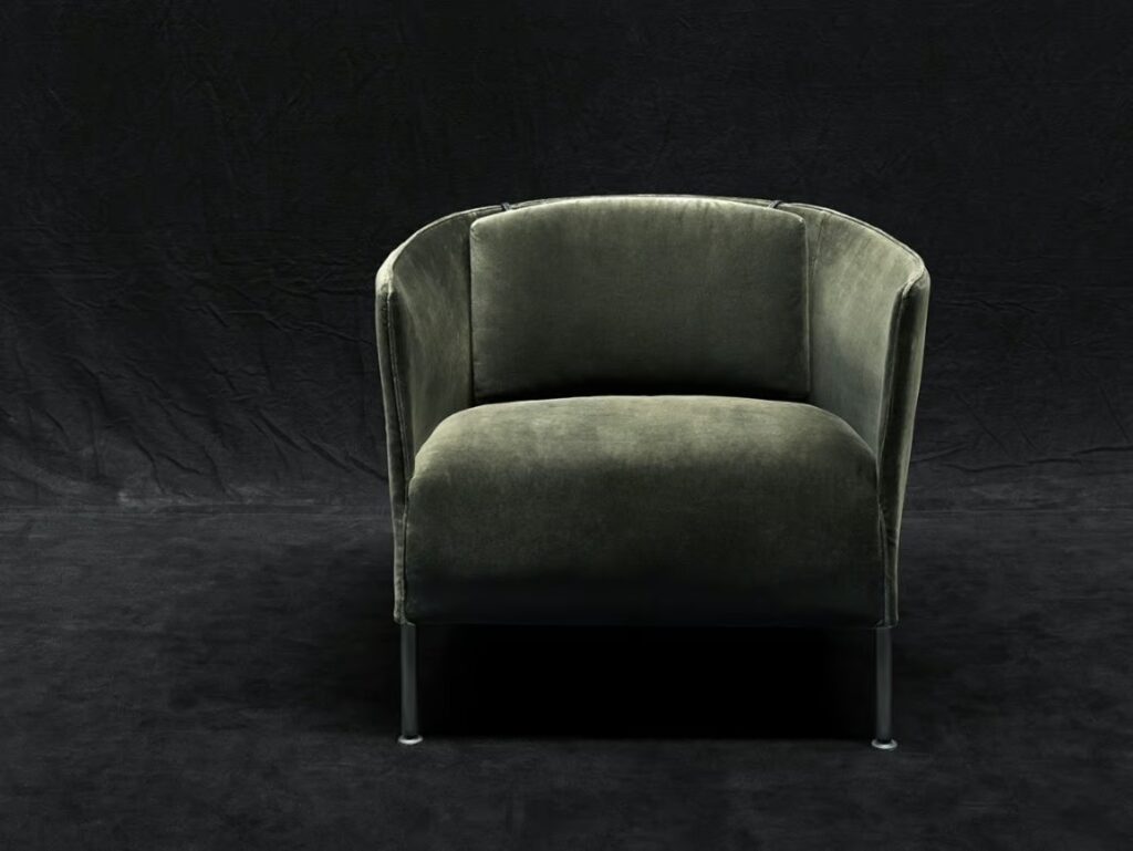 SARTOR.C ist ein Sessel mit einem Gestell aus Stahlrohr, das mit schwarzem Epoxidpulver beschichtet ist. Sitzgestell aus mehrschichtigem Birkenholz, gefedert mit gekreuzten, beschichteten elastischen Gummibändern und Bezug aus 100% Polyäther, thermisch auf einen Polyamidsamt-Träger geklebt.