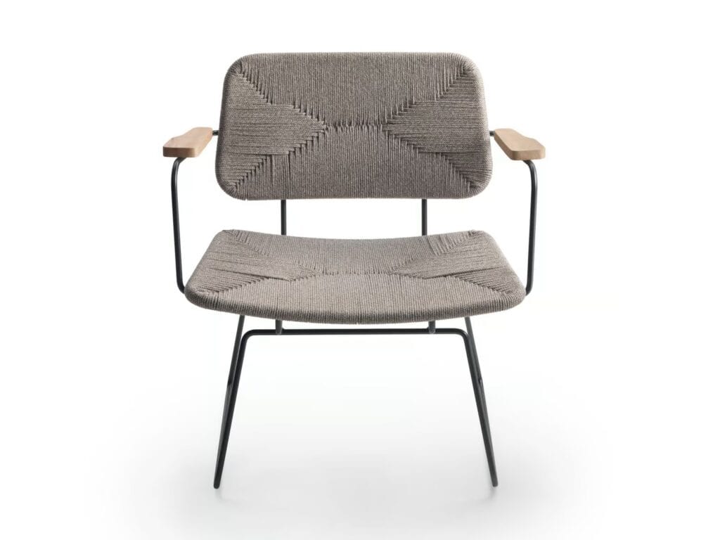 Das Gestaltungskonzept liegt in dem entschiedenen Materialkontrast: Das Gestell ist aus nüchternem Edelstahl, während sich Sitz und Rückenlehne durch ein feines Geflecht aus matter Polypropylen-Kordel in den Farben Natur, Eis, Stroh und Anthrazit auszeichnen.