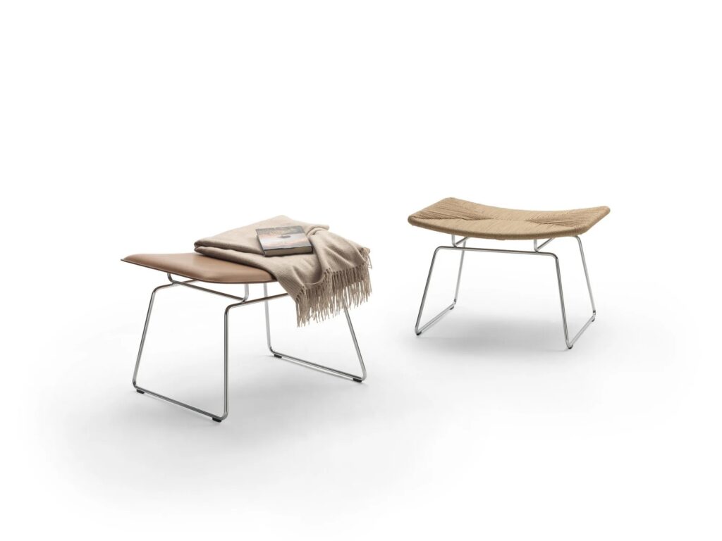 Das Gestell der Sitze mit seiner schlichten Linienführung ist schmucklos streng aus Metall, während Sitz und Rückenlehne sich durch das feine Geflecht aus Papier- oder Seegraskordel kennzeichnen, eine scheinbar einfache, aber trotzdem komplexe Verarbeitung, die auch heute noch vollständig handgefertigt ist.
