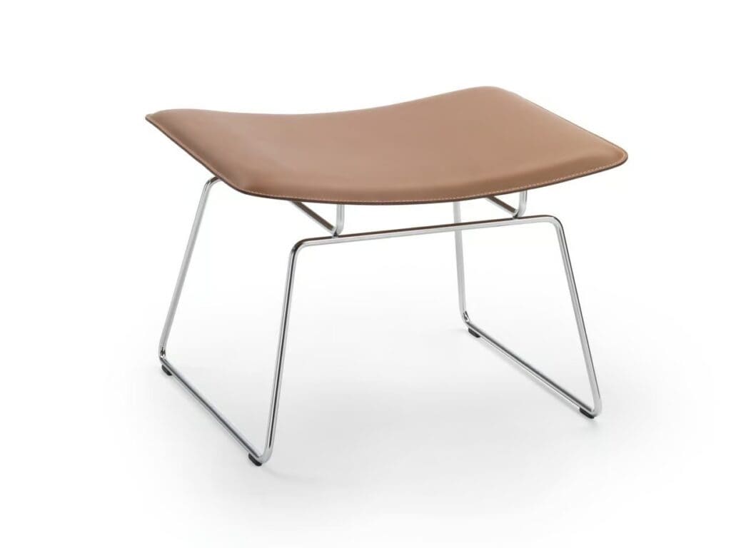 Eine andere stilistische Interpretation zeigt der Sessel Echoes S.H., bei dem das Metallgestell mit Leder kombiniert wird: Eine einfache, aber effektvolle Kombination, die dank der ergonomischen Form von Sitz und Rückenlehne hohen Komfort garantiert.