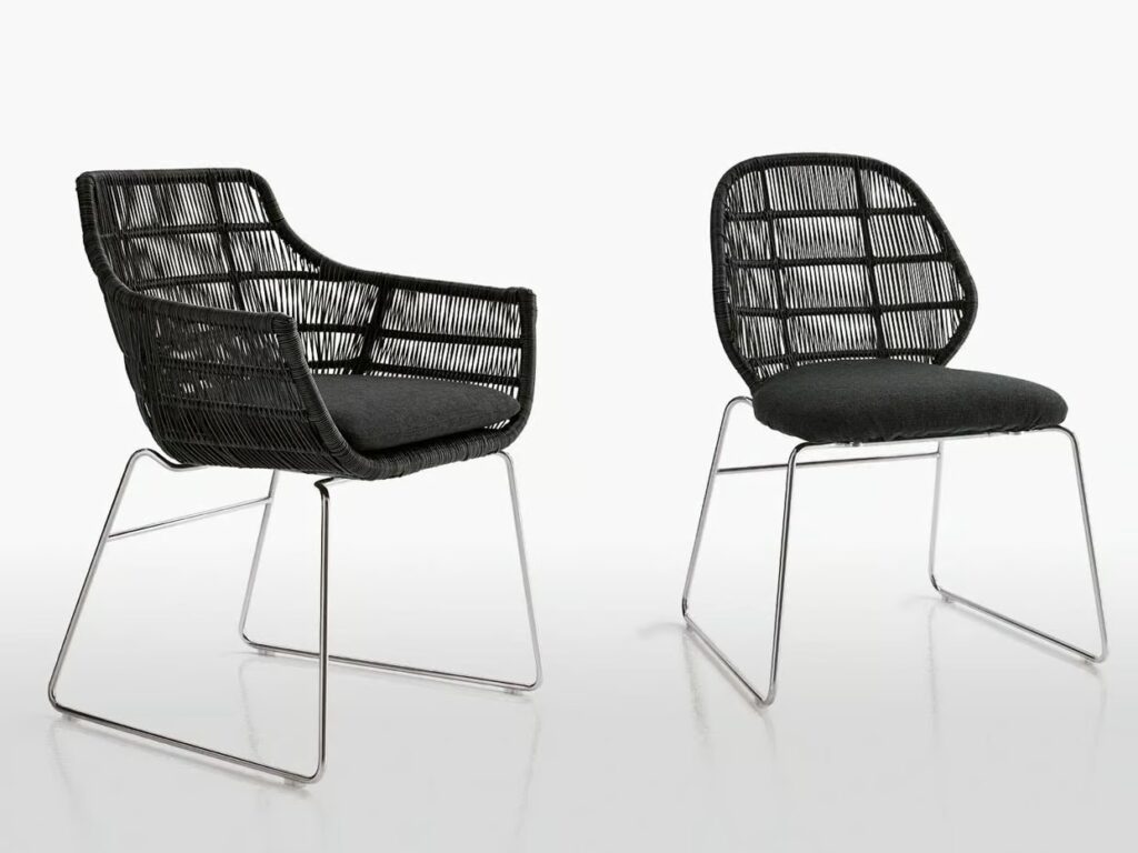 Mit Crinoline führt die forschungsarbeit von Patricia Urquiola zu dreidimensionalen mustern und weichen, geschwungenen formergebnissen. Stühle, kleiner sessel und sessel unterscheiden sich in form und höhe. Zu den schwarz-weiss und schwarz-bronzefarben polyethylenfaser-geflechten gesellen sich mit seil natur oder bronzefarben. Unterschiedlich sind die untergestell: aus edelstahl glänzend oder mit ausführungen entweder analog oder im kontrast zur sitz. Der kleine runde sessel wird durch den auf sitz und rückenlehne gelegten poncho aus natur, magenta oder bronzefarben seil noch effektvoller. Im einklang mit der serie crinoline, weist auch der tisch die runden formen auf, die sitze und das polyethylenfaser-geflecht kennzeichnen, erhältlich in zwei verschiedenen ausführungen: schwarz-weiss oder schwarz-bronzefarben. Das untergestell besteht aus zwei miteinander verbundenen, kelchförmigen elementen und dient als auflage für die tischplatten aus glas weiss oder hpl laminat geschichtet full color weiss mit durchgehenden, strahlenförmig angeordneten version kann zudem in der mitte ein sonnenschirm angebracht werden.