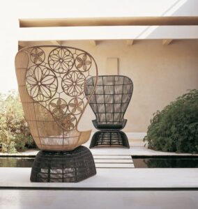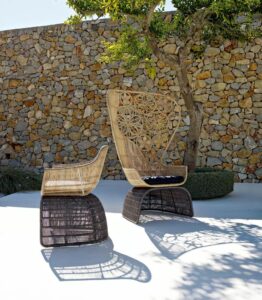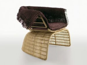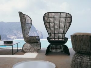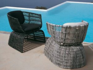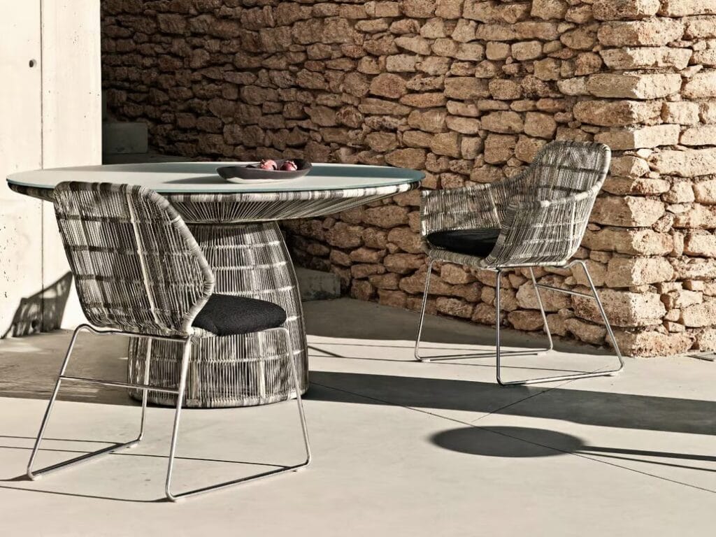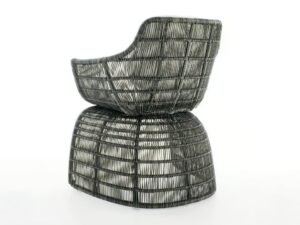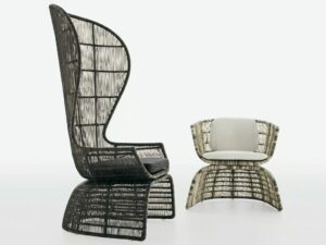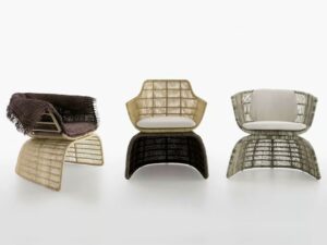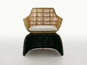 Mit Crinoline führt die forschungsarbeit von Patricia Urquiola zu dreidimensionalen mustern und weichen, geschwungenen formergebnissen. Stühle, kleiner sessel und sessel unterscheiden sich in form und höhe. Zu den schwarz-weiss und schwarz-bronzefarben polyethylenfaser-geflechten gesellen sich mit seil natur oder bronzefarben. Unterschiedlich sind die untergestell: aus edelstahl glänzend oder mit ausführungen entweder analog oder im kontrast zur sitz. Der kleine runde sessel wird durch den auf sitz und rückenlehne gelegten poncho aus natur, magenta oder bronzefarben seil noch effektvoller. Im einklang mit der serie crinoline, weist auch der tisch die runden formen auf, die sitze und das polyethylenfaser-geflecht kennzeichnen, erhältlich in zwei verschiedenen ausführungen: schwarz-weiss oder schwarz-bronzefarben. Das untergestell besteht aus zwei miteinander verbundenen, kelchförmigen elementen und dient als auflage für die tischplatten aus glas weiss oder hpl laminat geschichtet full color weiss mit durchgehenden, strahlenförmig angeordneten version kann zudem in der mitte ein sonnenschirm angebracht werden.