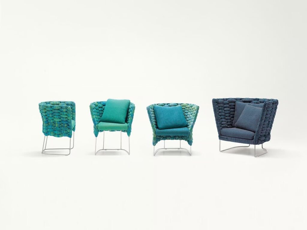 Ami ist eine Kollektion, die aus Stuhl, Sessel und Sofas besteht. Struktur aus rostfreiem Stahl, Untergestell aus rostfreiem Stahl mit satinierter Oberfläche und Abstandshaltern aus Kunststoff. Der Stuhl und der kleine Sessel sind mit einer festen Sitzfläche aus kalt eingespritztem, geschäumtem Polyurethan ausgestattet, die mit elastischen Gurten versehen ist; der Sessel und die Sofas haben ein abnehmbares Sitzkissen mit abnehmbarem Bezug; die elastischen Gurte sind in die Stahlstruktur integriert. Die Polsterung der Struktur ist handgeflochten mit einer Schlauchkette; beim Sessel und bei den Sofas kann das Geflecht mit farblich abgestimmten Filzstützen kombiniert werden. Die festen und abnehmbaren Sitzkissen sind in ausgewählten Stoffen der Kollektion erhältlich. Zur Vervollständigung des Sitzes sind ein oder mehrere lose Kissen erforderlich.