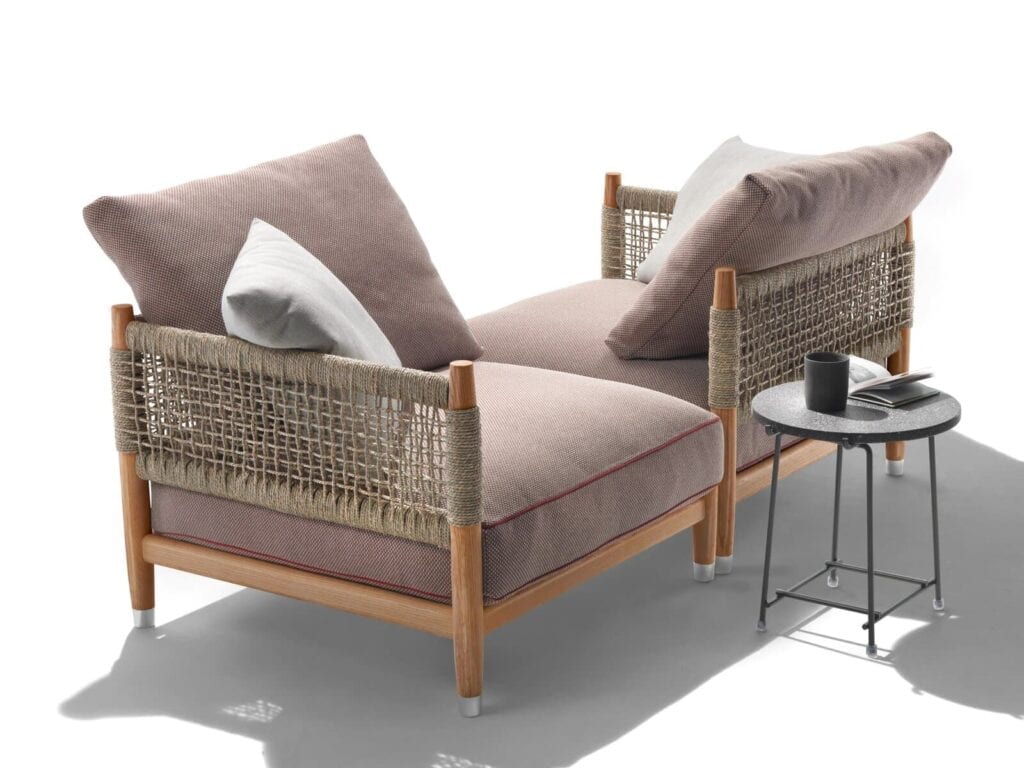 PARKER - Die Retro-Inspiration für das Sofa Parker Outdoor ist deutlich an den leichten Linien, den natürlichen Geflechten und der handwerklichen Verarbeitung erkennbar, die Ausdruck der hohen Handwerkskunst von Flexform sind. Das Gestell des Sofas Parker Outdoor besteht aus Stahl und massivem Iroko-Holz, das von Hand gedrechselt und bearbeitet wird, und auch das Geflecht für die Bespannung der Rückenlehne und der Armlehnen wird in reiner Handarbeit ausgeführt. Das Sitzkissen ist ungeteilt und die großen, weich gepolsterten Kissen werden locker an der Rückenlehne mit Bespannung aus Schnur drapiert. Die Beine sind mit Füßen ausgestattet, die im Druckgussverfahren aus einer Metalllegierung hergestellt werden und über Nylongleiter verfügen. Die Familie Parker Outdoor umfasst Zweisitzer- und Dreisitzersofas, einen Polsterhocker und ein Element mit Rückenlehne und nur einer Armlehne, mit dem sich besondere Konfigurationen schaffen lassen. Wenn das Sofa Parker Outdoor für längere Zeit nicht verwendet wird, wird empfohlen, die Kissen abzunehmen und an einem trockenen Ort aufzubewahren und das Gestell des Sofas mit der entsprechenden Schutzhülle abzudecken, damit sich das Sofa sich seinen guten Zustand und sein ursprüngliches Aussehen langfristig bewahrt. Der Großteil der Teile, aus denen das Sofa Parker Outdoor besteht, ist recycelbar.