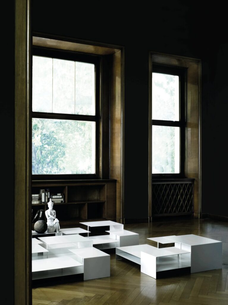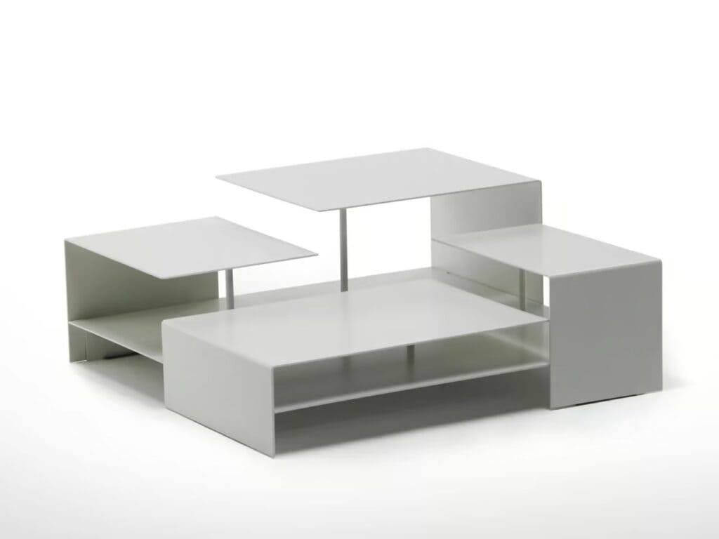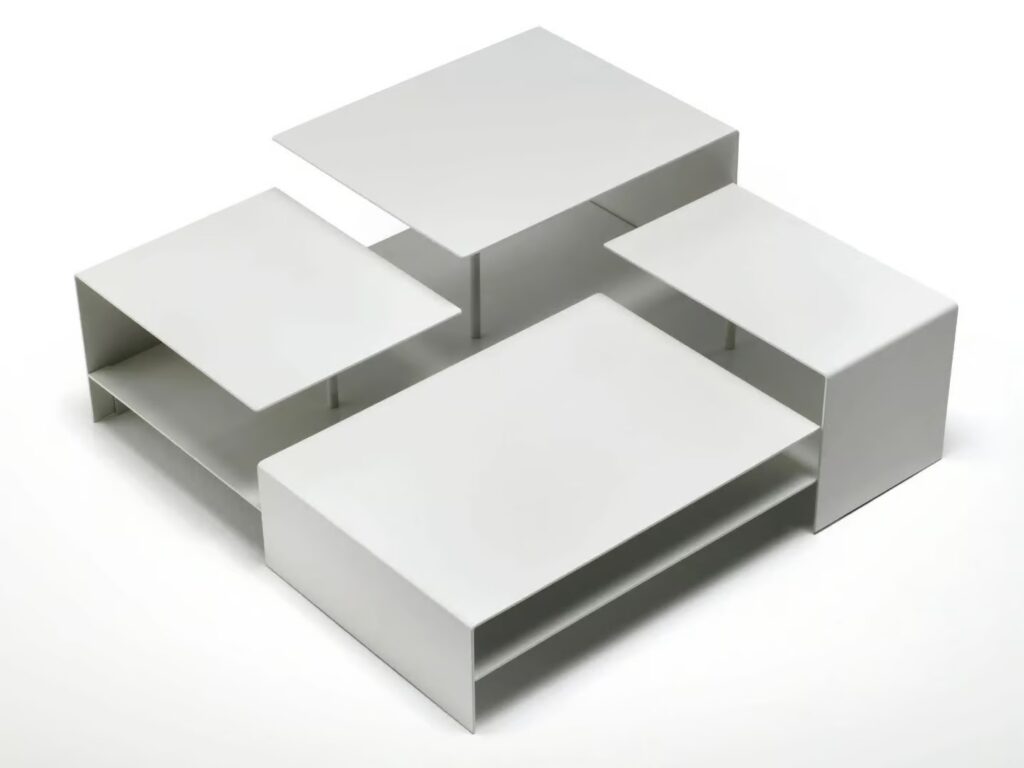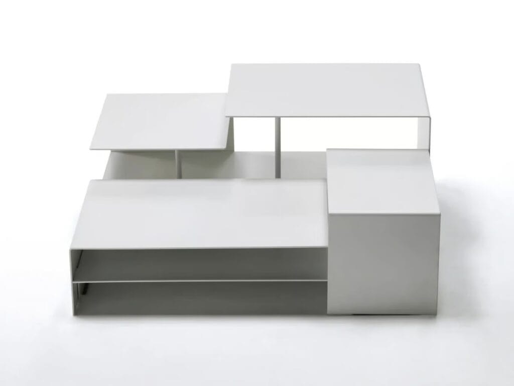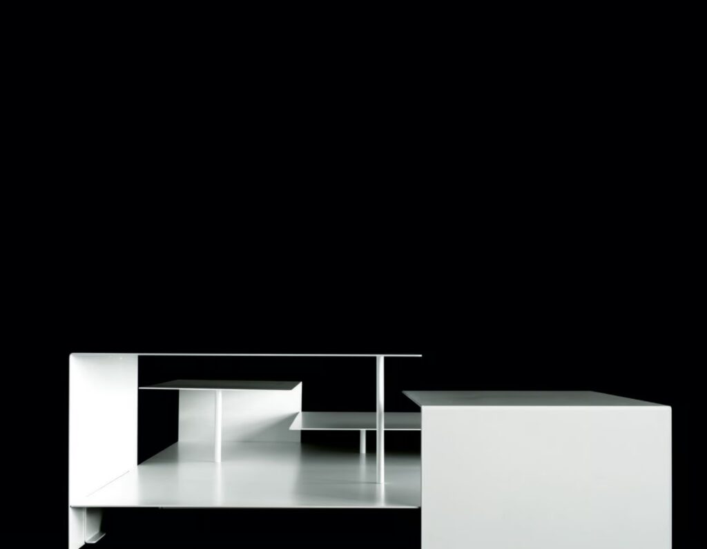 B2 ist der Tisch mit Stahlstruktur, bestehend aus 4 Platten aus 2,5 mm starkem Stahlblech, die mit dem Sockel verschraubt sind, in verschiedenen Höhen und Abmessungen, beschichtet mit Epoxidpulver in RAL-K7 9010 weiss oder schwarz ANODIK.
