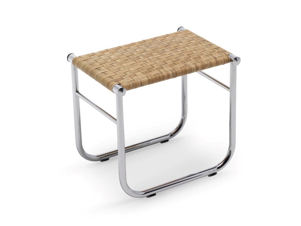 Ein Hocker mit architektonischer Form, in der die Liebe der Designerin für poetische Harmonie zum Ausdruck kommt. Die erste Version wurde von Charlotte Perriand 1927 für das Esszimmer in ihrem Pariser Atelier entworfen und verfügt über ein Metallgestell aus Hohlprofil, das mit einer Sitzfläche aus Rattan kombiniert ist. Das aktuelle Modell wird mit einem mit Chrom(III) hartverchromten Stahlgestell ausgeführt, das mit einer Sitzfläche mit verschiedenen Bezügen personalisiert werden kann, darunter auch mit einem Lederbezug oder mit der klassischen Bespannung aus Rattan.