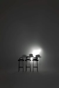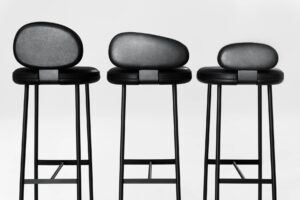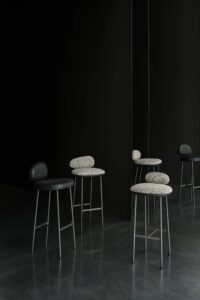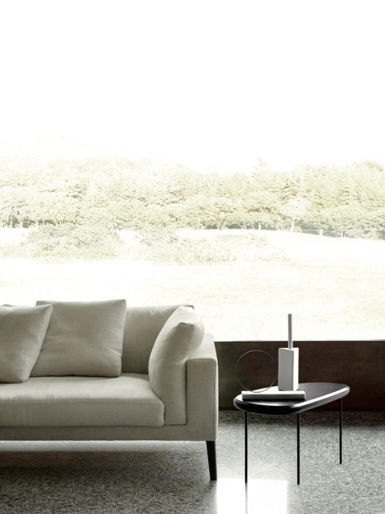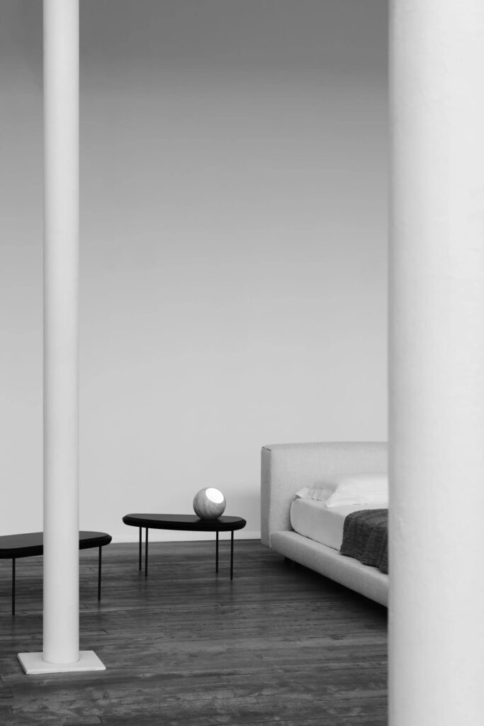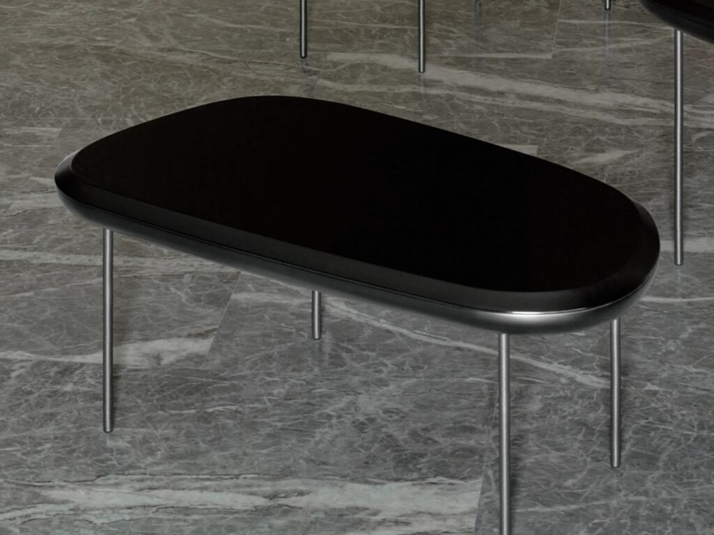 Pebble ist eine Familie organisch geformter Couchtische mit einer Monoblockplatte, die aus einer abgeschrägten Platte besteht, die in mattschwarz lackiertem MDF oder in Marmor erhältlich ist und mit der mattschwarz lackierten MDF-Unterplatte verschraubt ist, in der die Befestigungsbuchsen für die Ø12 mm Stahlrohrfüsse untergebracht sind, die mit Epoxypulver grau lackiert sind. Der Halt auf dem Boden wird durch Kunststoffabstandshalter gewährleistet. Die Marmorplatten, die in den Farben Forest Green, Carrara white, Levanto red, Marquinia black und Sahara Noir erhältlich sind, haben eine satinierte Oberfläche und eine transparente matte Schutzschicht oder eine matte oder glänzende Polyesteroberfläche.