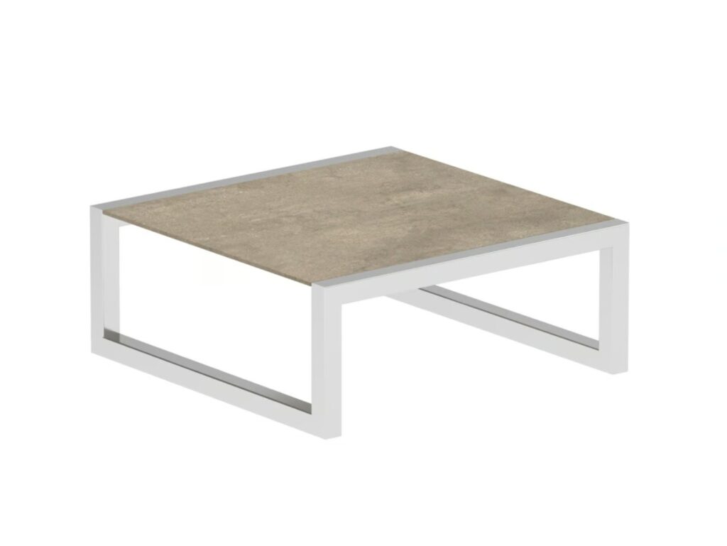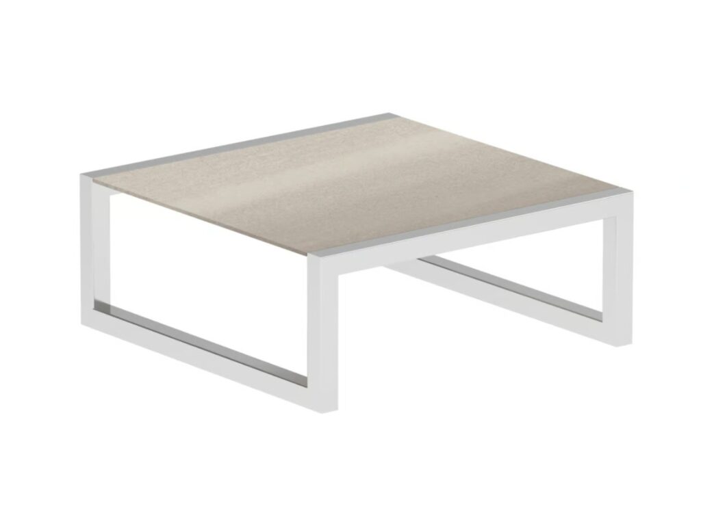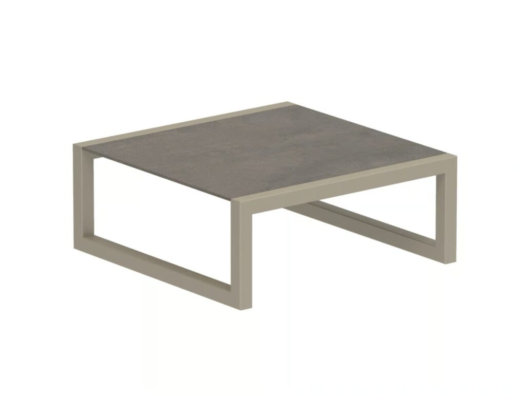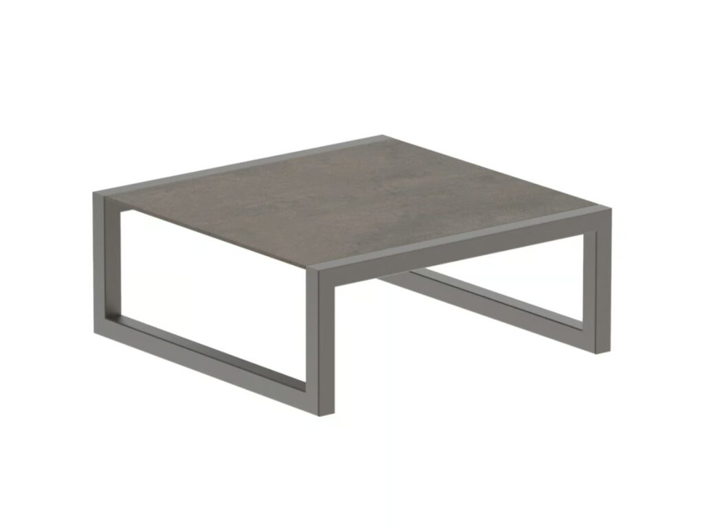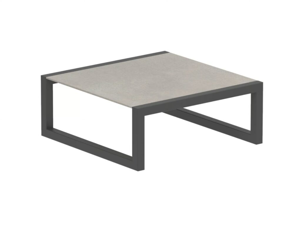 Ninix ist ein niedriger quadratischer Gartentisch aus Edelstahl und Teakholzplatte, der zur NINIX-Kollektion gehört.